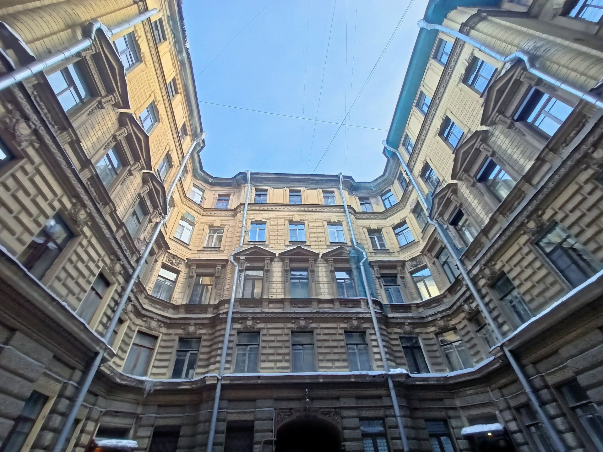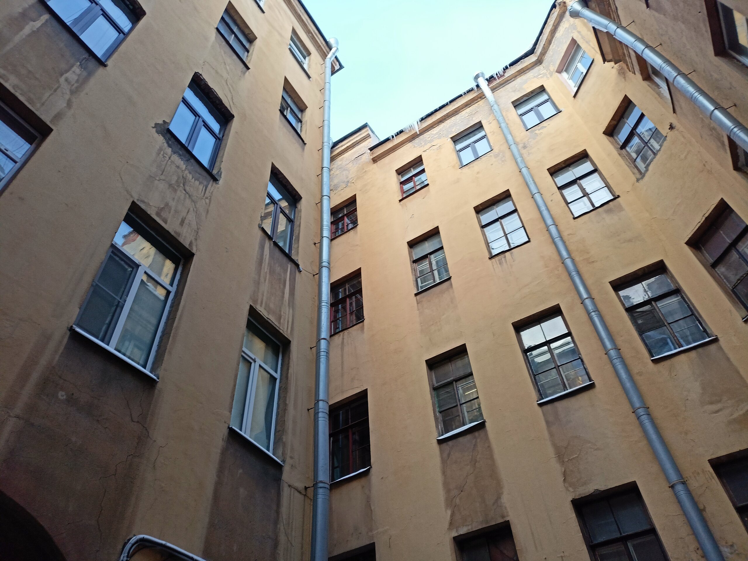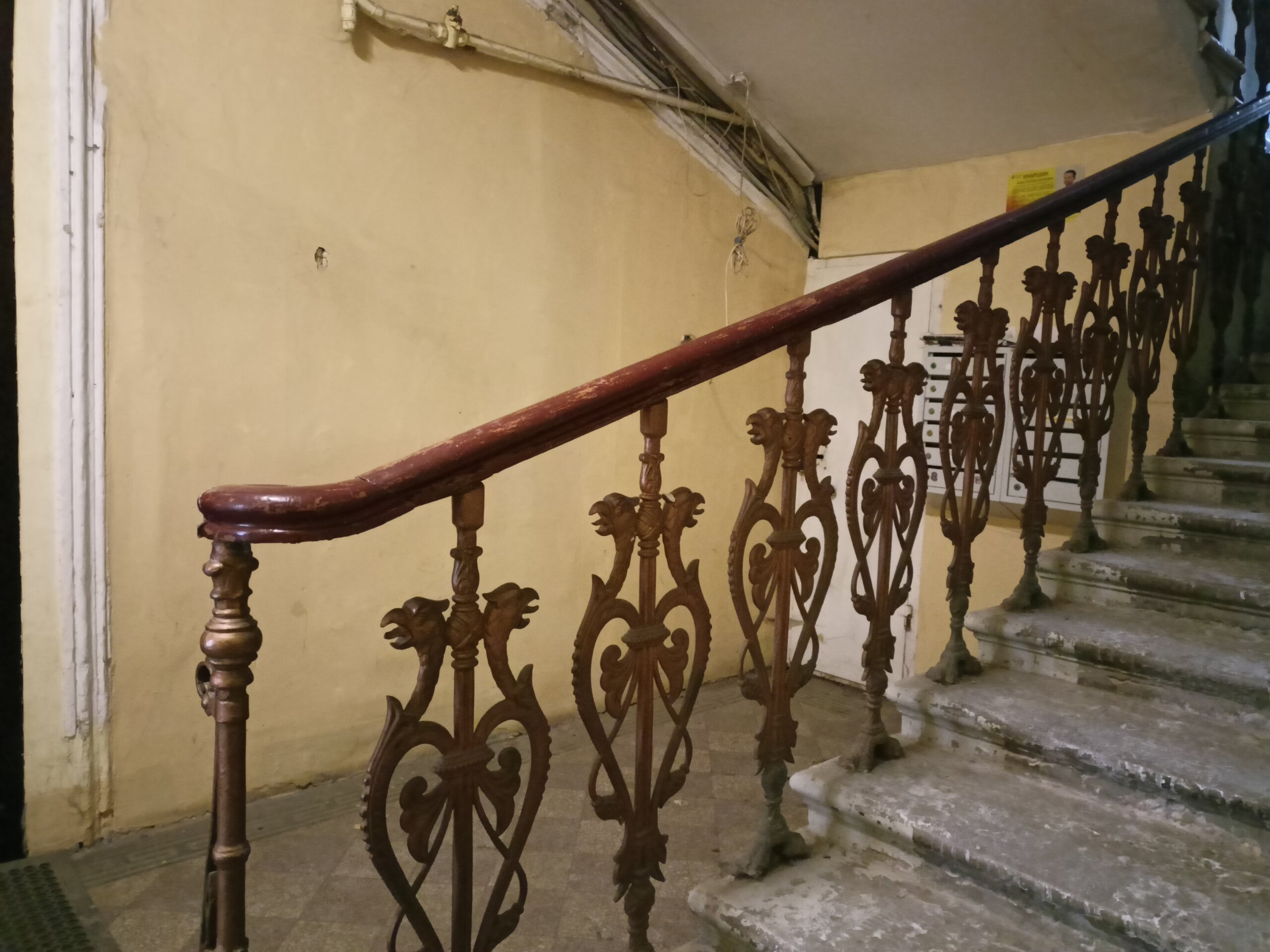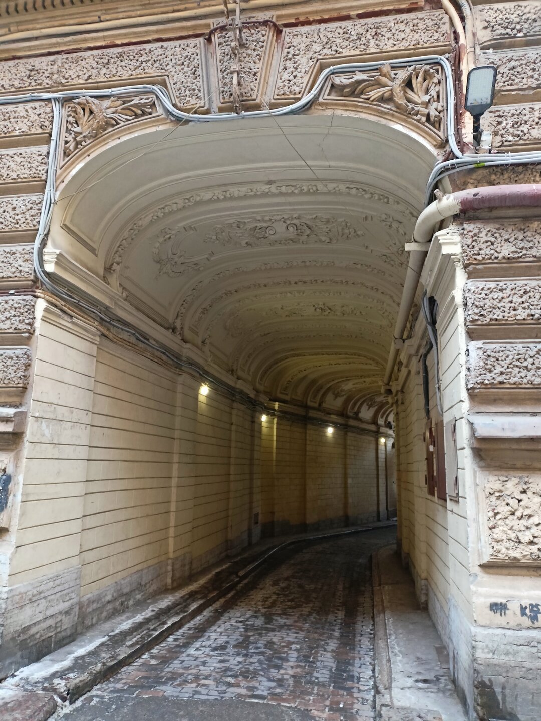 Через дворы пробирается на набережную Фонтанки и заходим в дом Елисеевых В отремонтированных дворах все электросетевые коммуникации стали убирать в пенал. Такое я увидела впервые. Более привычное когда десятки проводом тянутся вдоль домов Вот это со звёздами воздуховод для бомбоубежища А это вход в него Где-то так и остались навесные петли от больших дверей, которые вели в конюшни. Мне этот факт показался странным, ну значит так и было Входим в парадную дома Елисеевых Внутренний двор и поилка для лошадей в виде львиной головы Переходим в следующие дворы и на этом 1.5 часовая пробежка закончилась А вот эта напомнило, а как иначе , Венецию. Общая схожесть с той знаменитой лестницей есть). Здесь располагается знаменитая парадная ромашка.