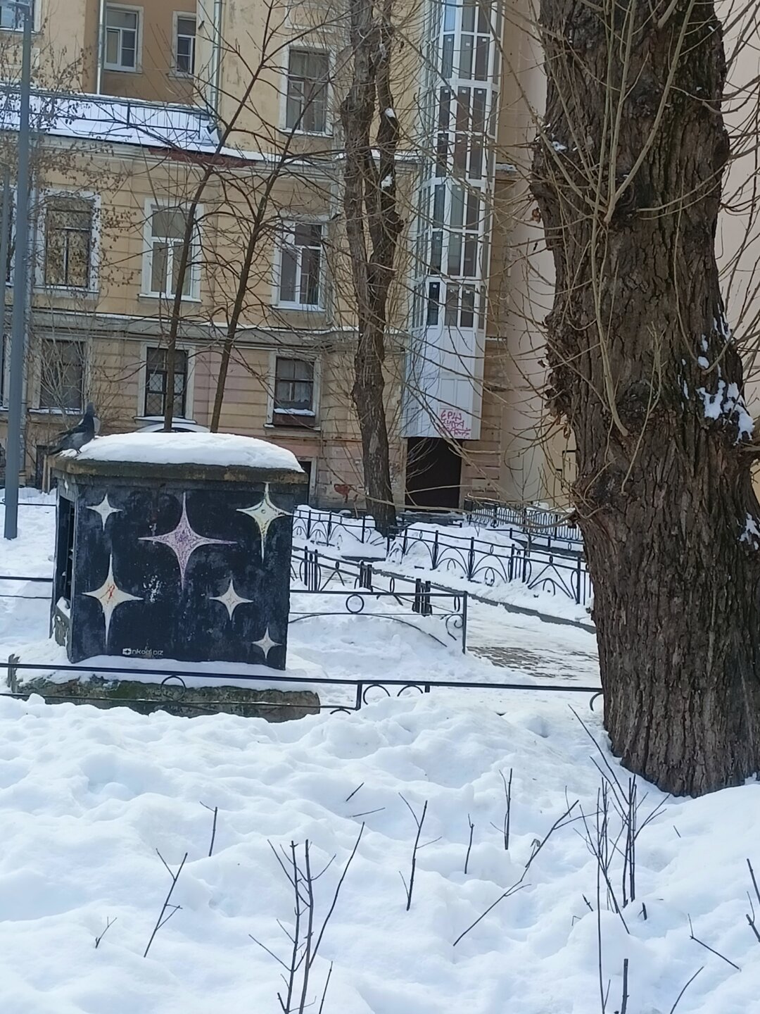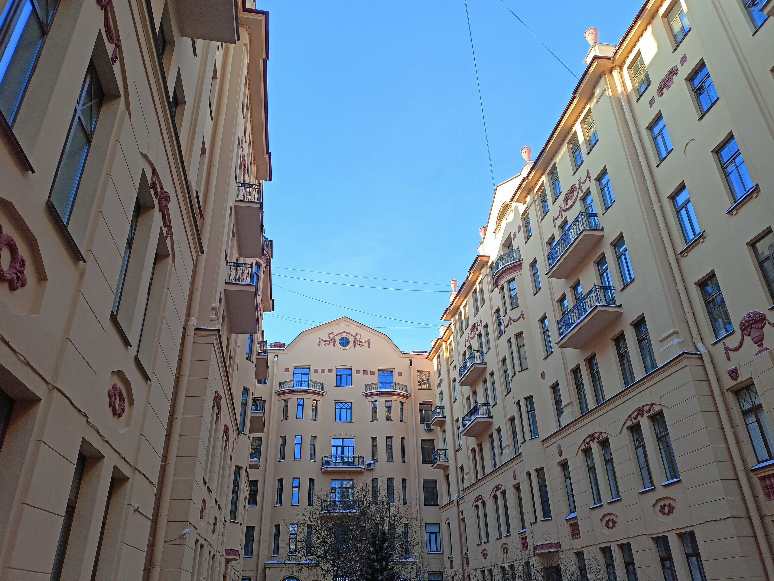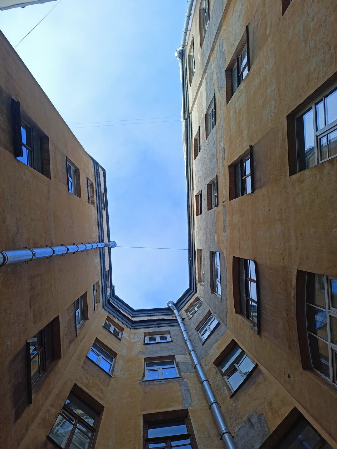 Через дворы пробирается на набережную Фонтанки и заходим в дом Елисеевых В отремонтированных дворах все электросетевые коммуникации стали убирать в пенал. Такое я увидела впервые. Более привычное когда десятки проводом тянутся вдоль домов Вот это со звёздами воздуховод для бомбоубежища А это вход в него Где-то так и остались навесные петли от больших дверей, которые вели в конюшни. Мне этот факт показался странным, ну значит так и было Входим в парадную дома Елисеевых Внутренний двор и поилка для лошадей в виде львиной головы Переходим в следующие дворы и на этом 1.5 часовая пробежка закончилась А вот эта напомнило, а как иначе , Венецию. Общая схожесть с той знаменитой лестницей есть). Здесь располагается знаменитая парадная ромашка.
