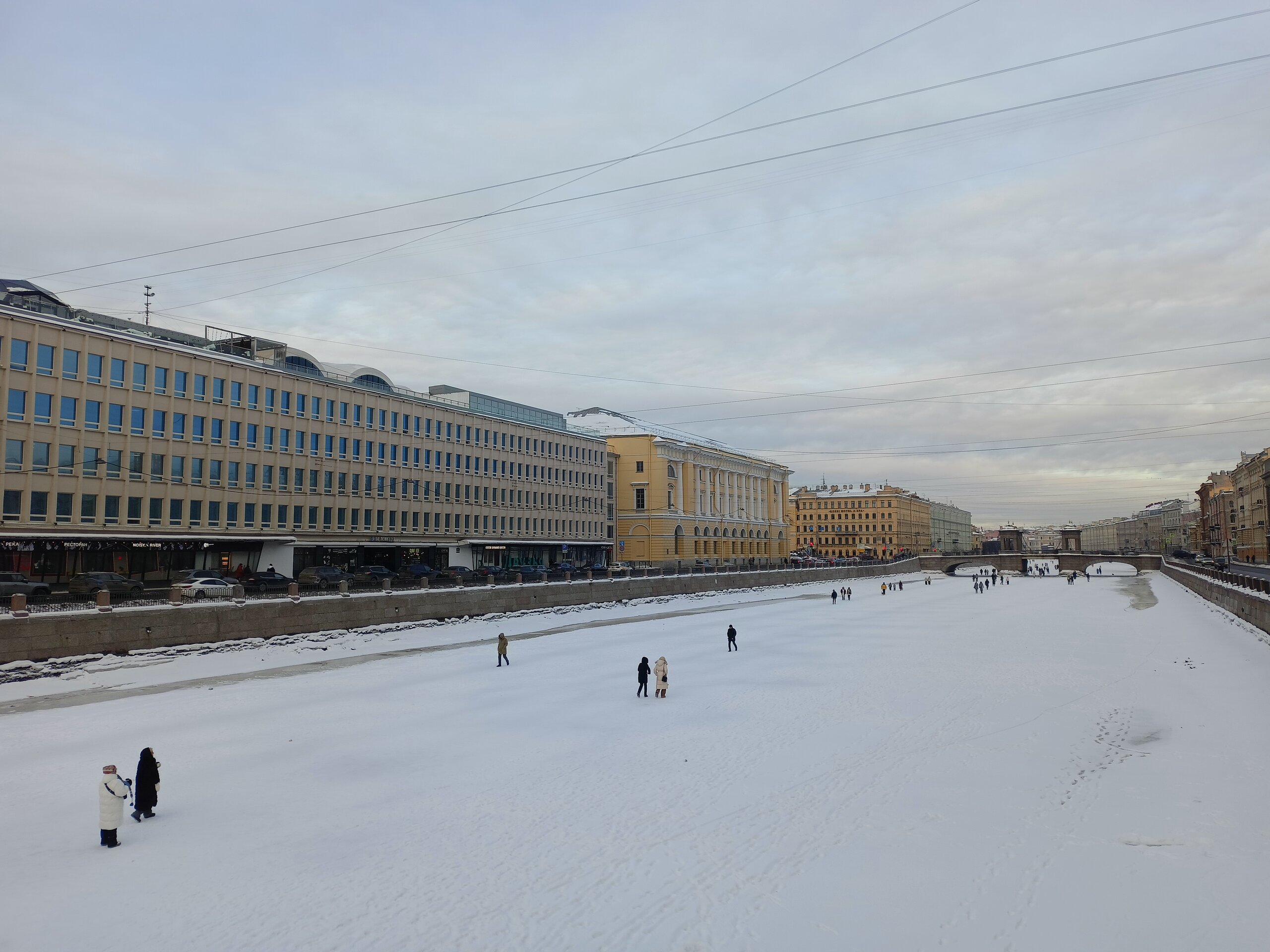 Следующий вечер уже заключительный, а значит надо сегодня прогуляться по дворцовой набережной. А на Неве был лыжник, передвигался свободным стилем) 22000 шагов.