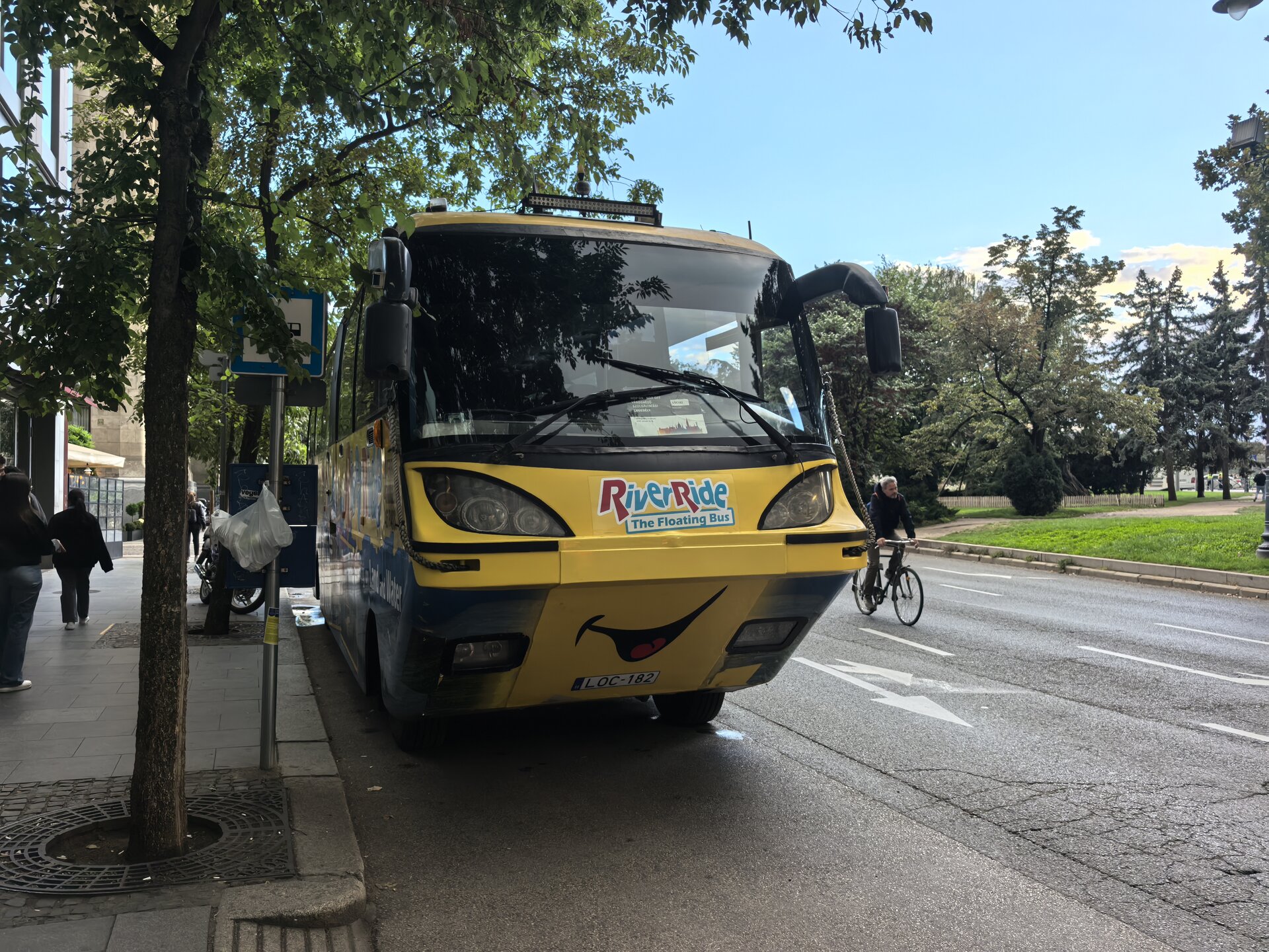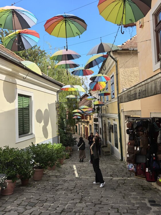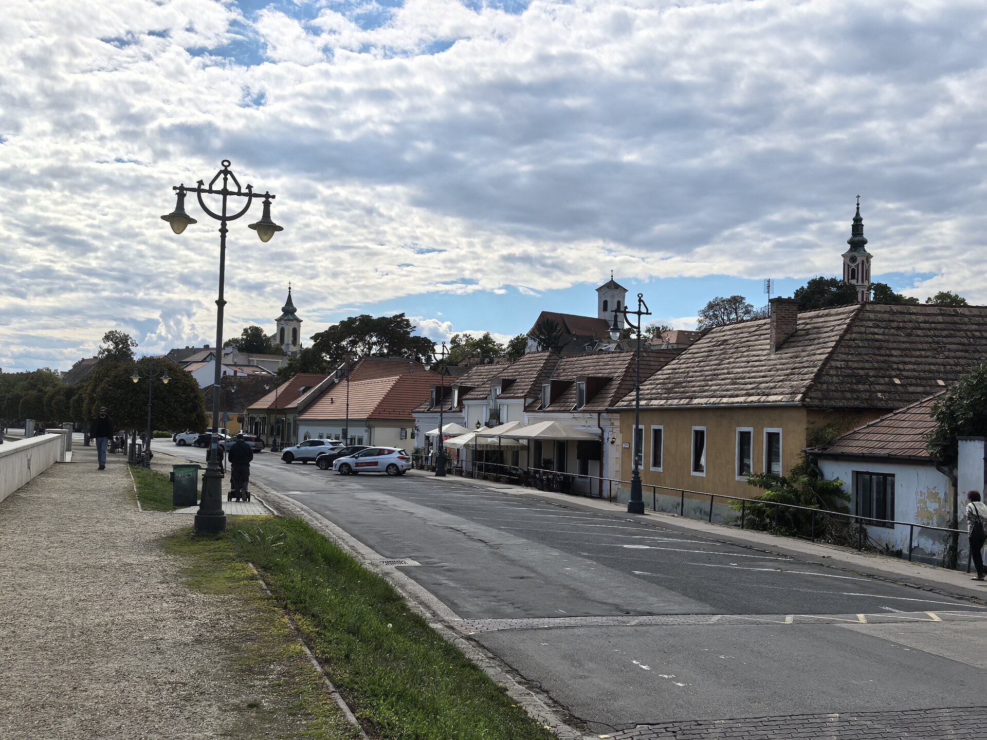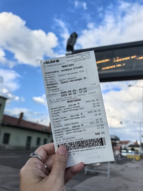 Конечно, мы не могли не заглянуть в новогодний круглогодичный магазинчик. Там было немноголюдно, и это хорошо. И какой красоты там только нет, и достаточно недорого, а где-то даже и дешево. Кстати, в Сентендре самые дешевые магнитики. Потом видели в центре Будапешта всё тоже самое, но в 2 раза дороже :) Вот такого маленького ангелочка мне привозили когда-то из Италии. Интересно, они везде стандартные или так совпало) А этот серый друг теперь живёт в Воронеже. Я коллекционирую фигурки котиков. Есть здесь и небольшой ретро-музей Традиционное фото всех туристов в Сентендре И гуляем дальше, погода разыгралась, тучки разошлись. Понедельник, туристов почти никого, весь город наш. Время близилось к вечеру, и мы засобирались ехать назад. Пришли на вокзал, подошли к автомату, чтобы купить билет... а он неличные-то и не принимает... сломался! ни у кого не принял! а карты у нас нет, и в Будапеште мы не стали брать обратный билет, понадеявшись на то что везде есть автоматы. Хорошо, что в Сентендре жд и автобусный вокзалы рядом. Мы перешли на автобусный вокзал, немного потыкались в автомат с билетами и всё же купили то что нам надо :) Вот так выглядят междугородние автобусы, вполне себе комфортные. Так как платформ достаточно много, и сразу несколько из них (одна за другой) показывали конечную остановку Будапешт с небольшой разницей во времени, а автобусы, оказывается, задерживаются и время отправления меняется, и на билете оно уже неактуально, то пришлось снова попрактиковать английский, спросив у водителя "а тот ли это вообще автобус". И хорошо, что спросили! Потому что наш автобус приехал позже времени билета, с опозданием минут на 15, а в наше время отправлялся другой опоздун. Доехали мы очень быстро, даже видели радугу по пути. Если пройти на сайт перевозчика, то можно отследить движение вашего автобуса в онлайне. В Будапеште сияло закатное солнце, вечер обещал быть красивым. Снова автобус-амфибия И вот посреди золотого закатного неба со стороны острова Маргит огромная туча затянула небо и включила дождь, разогнав нас и наши мысли о прогулки. Ну и ладно, всё равно завтра рано вставать 😉