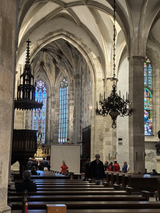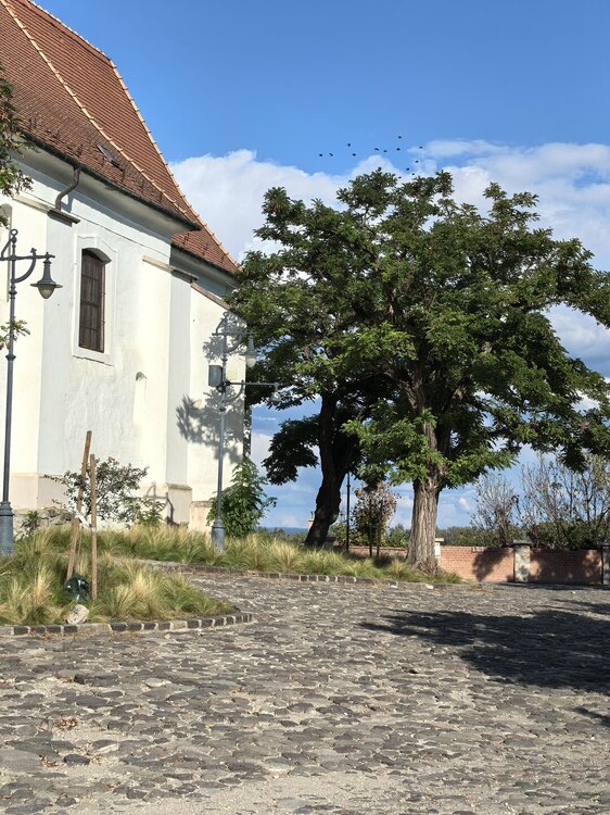 Наш день ещё не окончен. Мы переправляемся на пароме на другой берег озера и едем в Тихань. Мы едем к озеру Балатон. Оно очень знаменито, и я очень часто слышала о нём. Чем знаменито? Озеро-курорт :) Как сказал Олег в годы экономического спада многие венгры потянулись на свои курорты и получилось так, что каждый уважающий себя венгр должен был побывать на этом озере хотя бы раз в жизни. VID_20250927_172644.mp4 Мы прибываем на полуостров Тихань. Он образован в результате вулканической деятельности и когда-то был островом, а сейчас возвышается над озером Балатон на высоту 200 метров. В 11 веке король Андраш I с женой Анастасией Ярославовной (доя Ярослава Мудрого) основали здесь бенедиктинское аббатство. Здесь же похоронили короля, это единственное королевское захоронение дотурецкого периода на данный момент. Вход в костел платный, напротив расположен инфоцентр, в котором очень странно сделаны вытяжки - настолько тянет воздух в помещения с улицы, образуя сквозняк, что тяжелые большие стеклянные двери очень сложно открыть с нашей девочковой силой. С холма открываются красивые виды, а у подножия и по главной улочке расположены бесчисленные магазины, торгующие всякой всячиной, особенно лавандой в любом виде. Тут даже есть лавандовое пиво. Я где-то у нас в магазинах тоже видела такой крафт. Если отойти от туристических мест, то в остальном это просто милая деревушка. Завозим нашу туристку, которая продляет себе отдых в спа-отеле на острове Маргрит (опция этого тура). Когда-то на этом острове я была на национальном ужине с танцами и музыкой, но говорят в ковид очень многие закрылись и спрос на данный момент пропал.