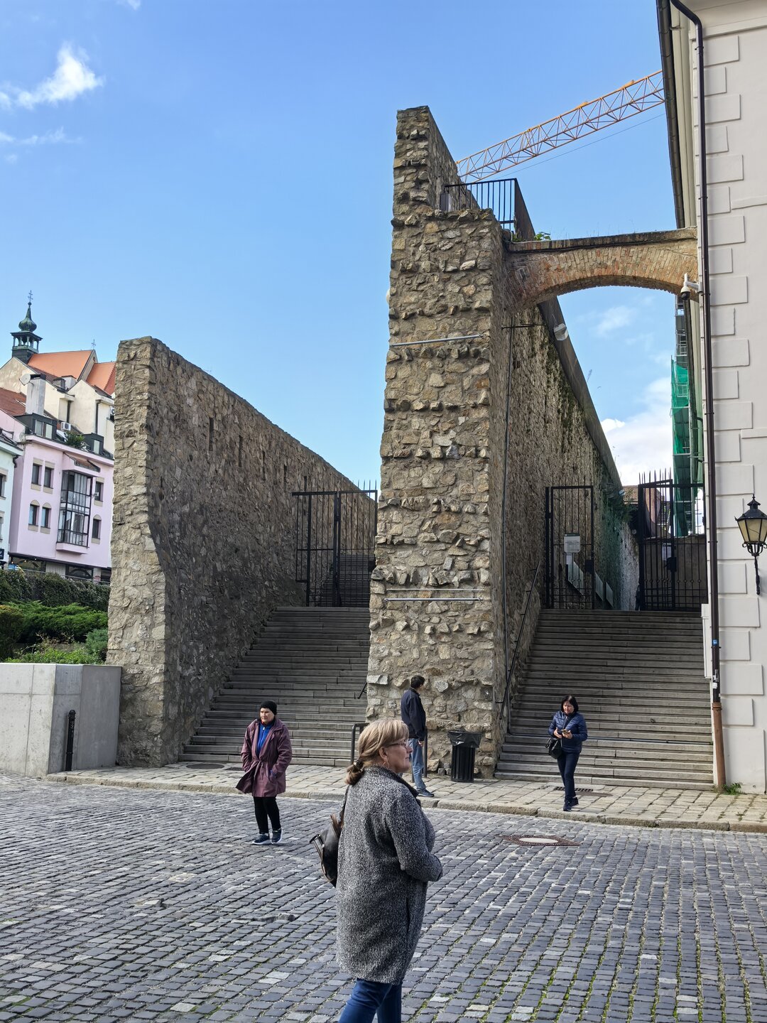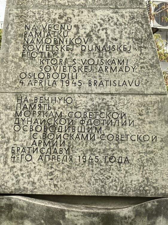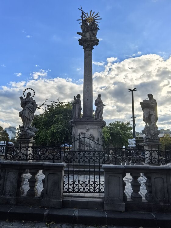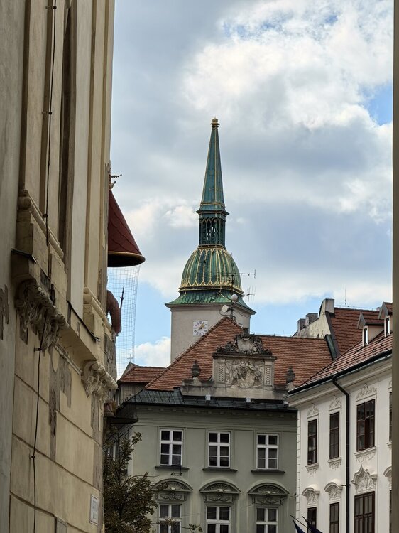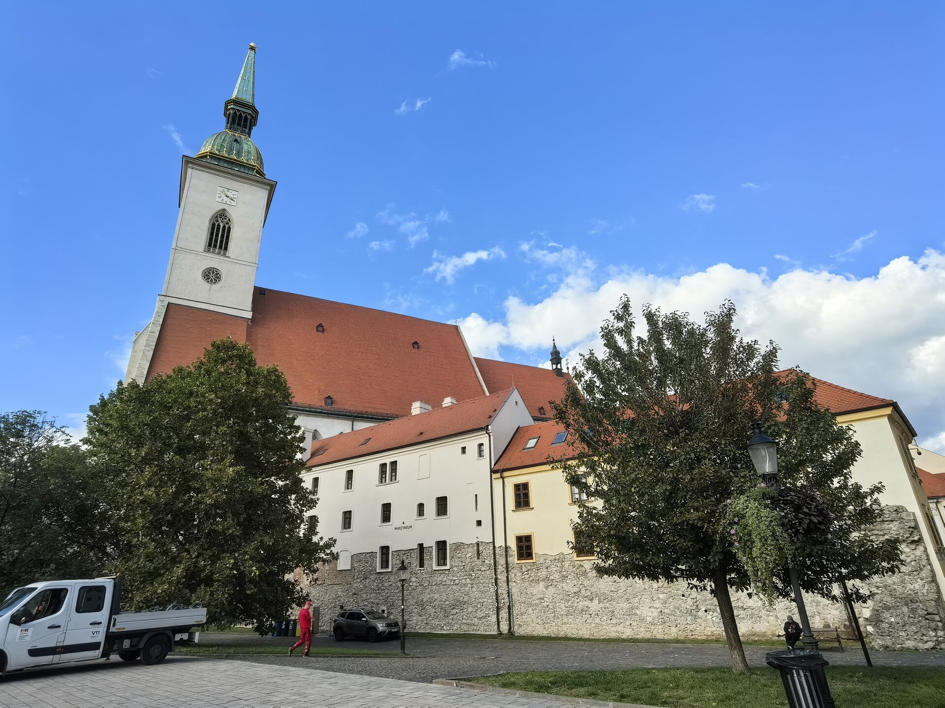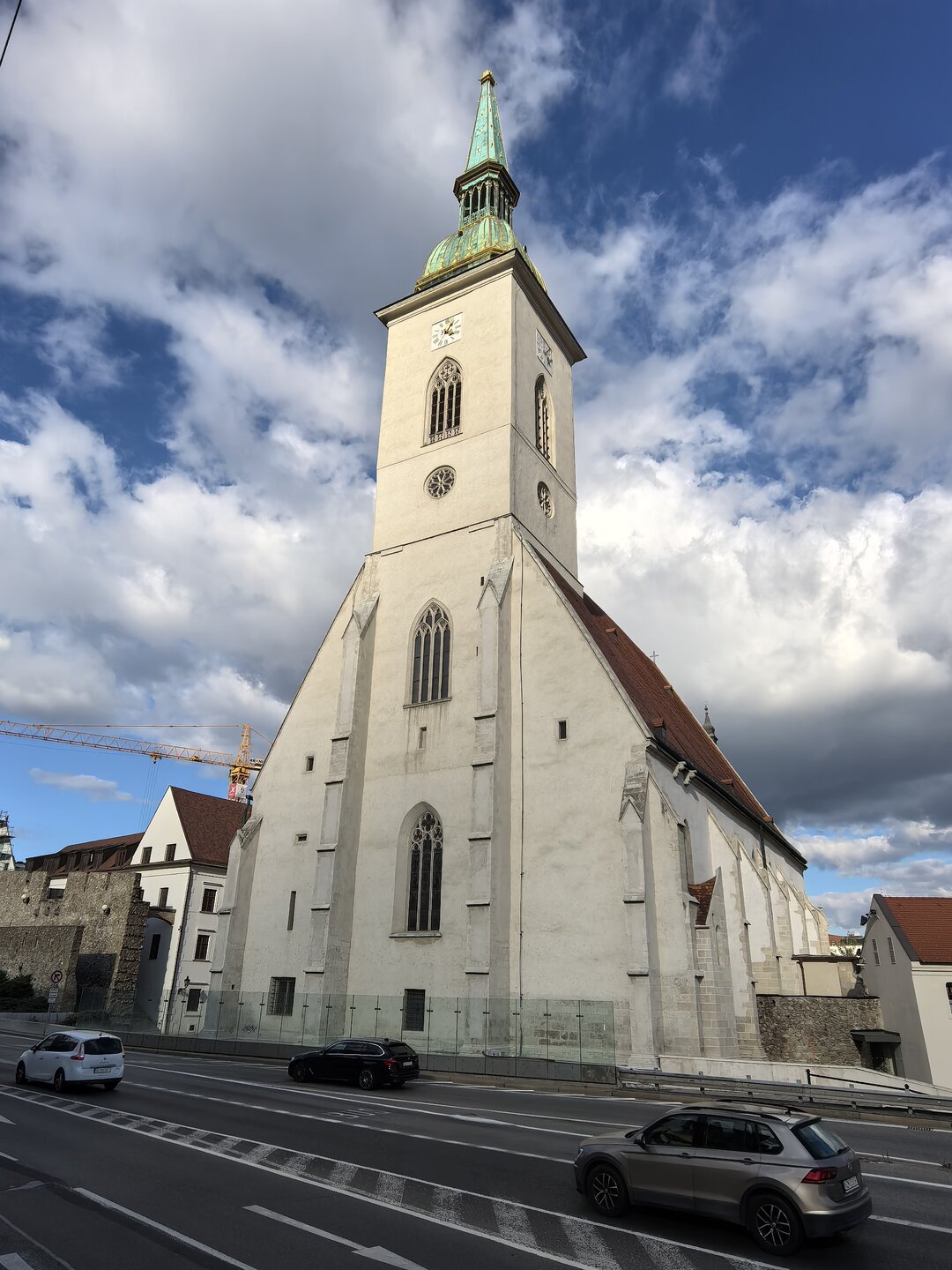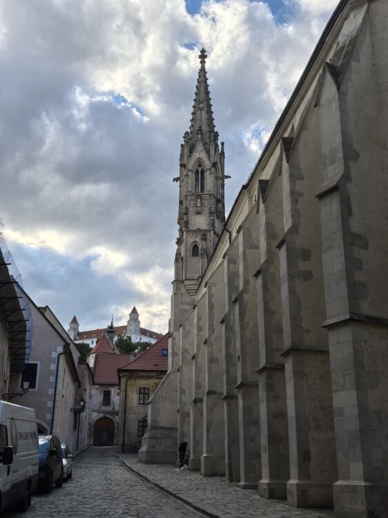 Конечно, нужно уже заглянуть в сувенирки... и знаете что?... Почти все товары похожи на венские сувениры, только надпись Братислава. Эх... Поэтому новогодняя тема. Всё красиво, но из-за перевозки в самолете купить не решились. Мы идём дальше узкими средневековыми улочками, где мало туристов. По ощущениям это было так необычно - как будто ты телепортировался в какой-нибудь 17 век и сейчас откуда-нибудь из-за угла вырулит карета с двойкой лошадей. Наверху мы уже видим Братиславский град. Мы выходим на ту же улицу, на которой стоит Национальный театр, только с другой стороны. Она тенистая и торговая, здесь несколько памятников, фотовыставка. Здесь бросается в глаза фонтан Девушка с оленем по сюжету сказки братьев Гримм "Братик и сестричка", который появился на этом месте в 1943 году. На фонтане выбито два имени. Скульптор, начинавший работу, не успел её закончить и скончался в 1940 году, а фонтан завершал уже другой человек. А это памятник Гансу Христиану Андерсону, который жил некоторое время в Братиславе. На плече у него сидит Оле-Лукое. Известна цитата Андерсона и Братиславе - «Žiadate ma, aby som vám porozprával rozprávku. Načo? Veď vaše mesto je rozprávkou!» «Просите, чтоб я рассказал Вам сказку? Но ведь Ваш город и есть сказка!» - и это правда. Ещё один чумной столб 18 века расположен на бывшей Рыбной площади. Чуть поодаль находится памятник холокосту и одновременно снесенной на этом месте Синагоге, изображение слева. И вот мы выходим к бывшим городским стенам. Старый город как бы встроен в неё, а вдоль стен проходит современная автомобильная дорога, отделяющая Старый город от Братиславского града. Рядом с остатками крепостной стены стоит огромнейший собор Святого Мартина. Собор начал строится в 13 веке на месте более древнего храма и... кладбища.. С 1563 года по 1830 являлся храмом для коронации императоров Священной Римской империи и Австро-Венгрии на трон Венгрии. Здесь была коронована Мария Тереза к примеру. Использовался и для музыкальных событий, здесь звучал Гайдн и Лист. А мы начинаем своё восхождение к Братиславскому граду, и чем выше, тем интереснее виды. Дорога на холм не крутая, но достаточно упорная. Особенно после нашего плотного обеда 😂 Мы выходим к стенам града со стороны Парламента, у которого развивается не только огромный флаг, но и флаги демонстрантов поменьше. Не стала снимать происходящее, тк нет понимания как отреагировала бы полиция. Хотя по надписи они должны быть и хорошими ребятами. Помогать и хранить.