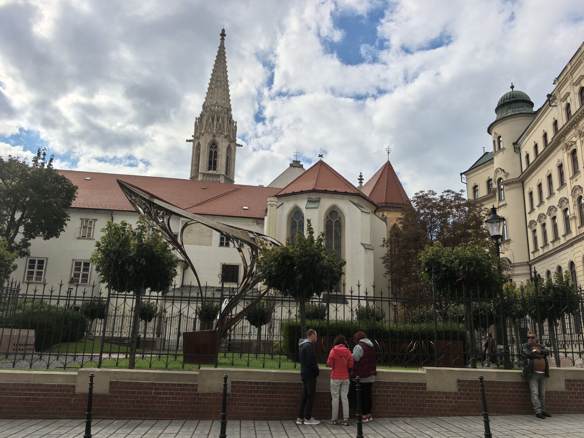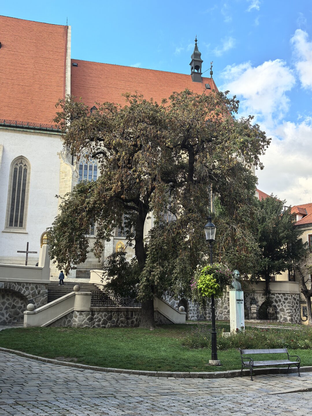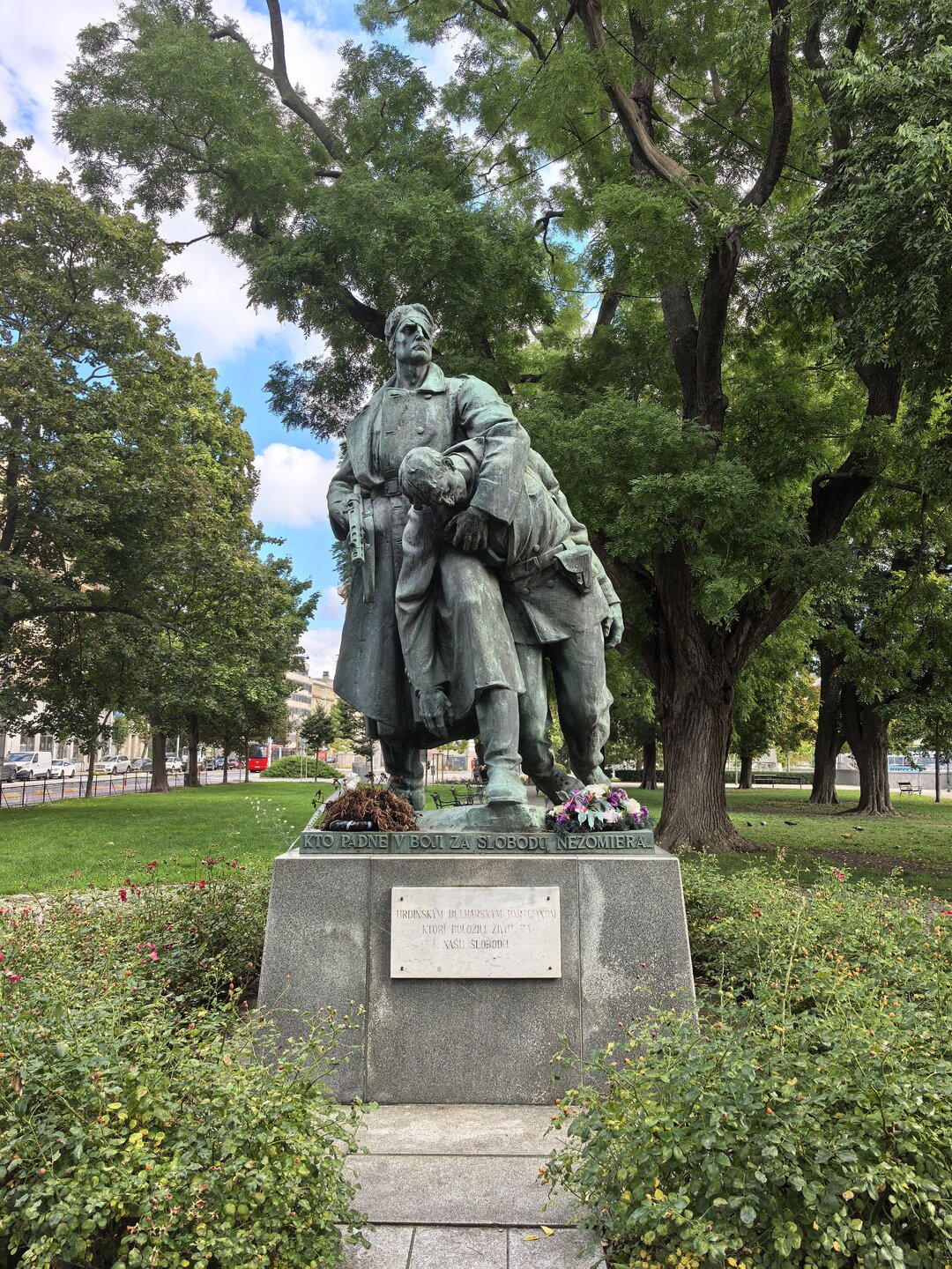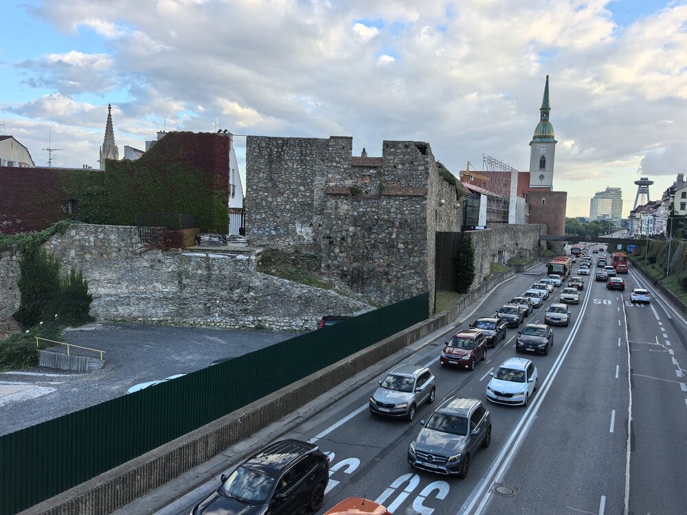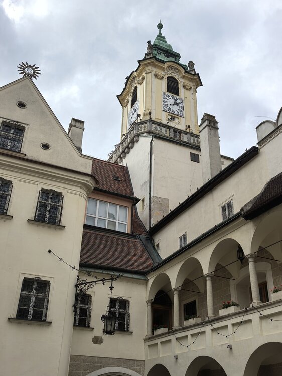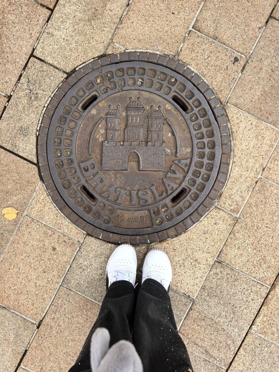 Конечно, нужно уже заглянуть в сувенирки... и знаете что?... Почти все товары похожи на венские сувениры, только надпись Братислава. Эх... Поэтому новогодняя тема. Всё красиво, но из-за перевозки в самолете купить не решились. Мы идём дальше узкими средневековыми улочками, где мало туристов. По ощущениям это было так необычно - как будто ты телепортировался в какой-нибудь 17 век и сейчас откуда-нибудь из-за угла вырулит карета с двойкой лошадей. Наверху мы уже видим Братиславский град. Мы выходим на ту же улицу, на которой стоит Национальный театр, только с другой стороны. Она тенистая и торговая, здесь несколько памятников, фотовыставка. Здесь бросается в глаза фонтан Девушка с оленем по сюжету сказки братьев Гримм "Братик и сестричка", который появился на этом месте в 1943 году. На фонтане выбито два имени. Скульптор, начинавший работу, не успел её закончить и скончался в 1940 году, а фонтан завершал уже другой человек. А это памятник Гансу Христиану Андерсону, который жил некоторое время в Братиславе. На плече у него сидит Оле-Лукое. Известна цитата Андерсона и Братиславе - «Žiadate ma, aby som vám porozprával rozprávku. Načo? Veď vaše mesto je rozprávkou!» «Просите, чтоб я рассказал Вам сказку? Но ведь Ваш город и есть сказка!» - и это правда. Ещё один чумной столб 18 века расположен на бывшей Рыбной площади. Чуть поодаль находится памятник холокосту и одновременно снесенной на этом месте Синагоге, изображение слева. И вот мы выходим к бывшим городским стенам. Старый город как бы встроен в неё, а вдоль стен проходит современная автомобильная дорога, отделяющая Старый город от Братиславского града. Рядом с остатками крепостной стены стоит огромнейший собор Святого Мартина. Собор начал строится в 13 веке на месте более древнего храма и... кладбища.. С 1563 года по 1830 являлся храмом для коронации императоров Священной Римской империи и Австро-Венгрии на трон Венгрии. Здесь была коронована Мария Тереза к примеру. Использовался и для музыкальных событий, здесь звучал Гайдн и Лист. А мы начинаем своё восхождение к Братиславскому граду, и чем выше, тем интереснее виды. Дорога на холм не крутая, но достаточно упорная. Особенно после нашего плотного обеда 😂 Мы выходим к стенам града со стороны Парламента, у которого развивается не только огромный флаг, но и флаги демонстрантов поменьше. Не стала снимать происходящее, тк нет понимания как отреагировала бы полиция. Хотя по надписи они должны быть и хорошими ребятами. Помогать и хранить.