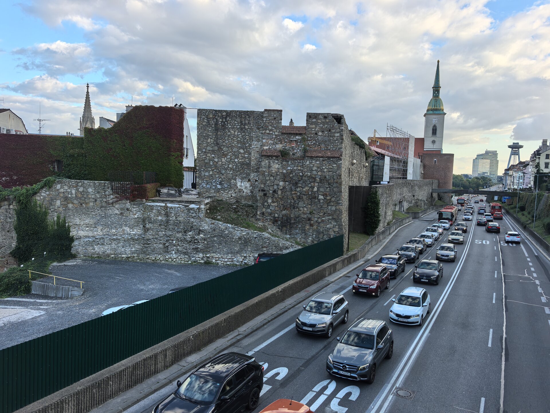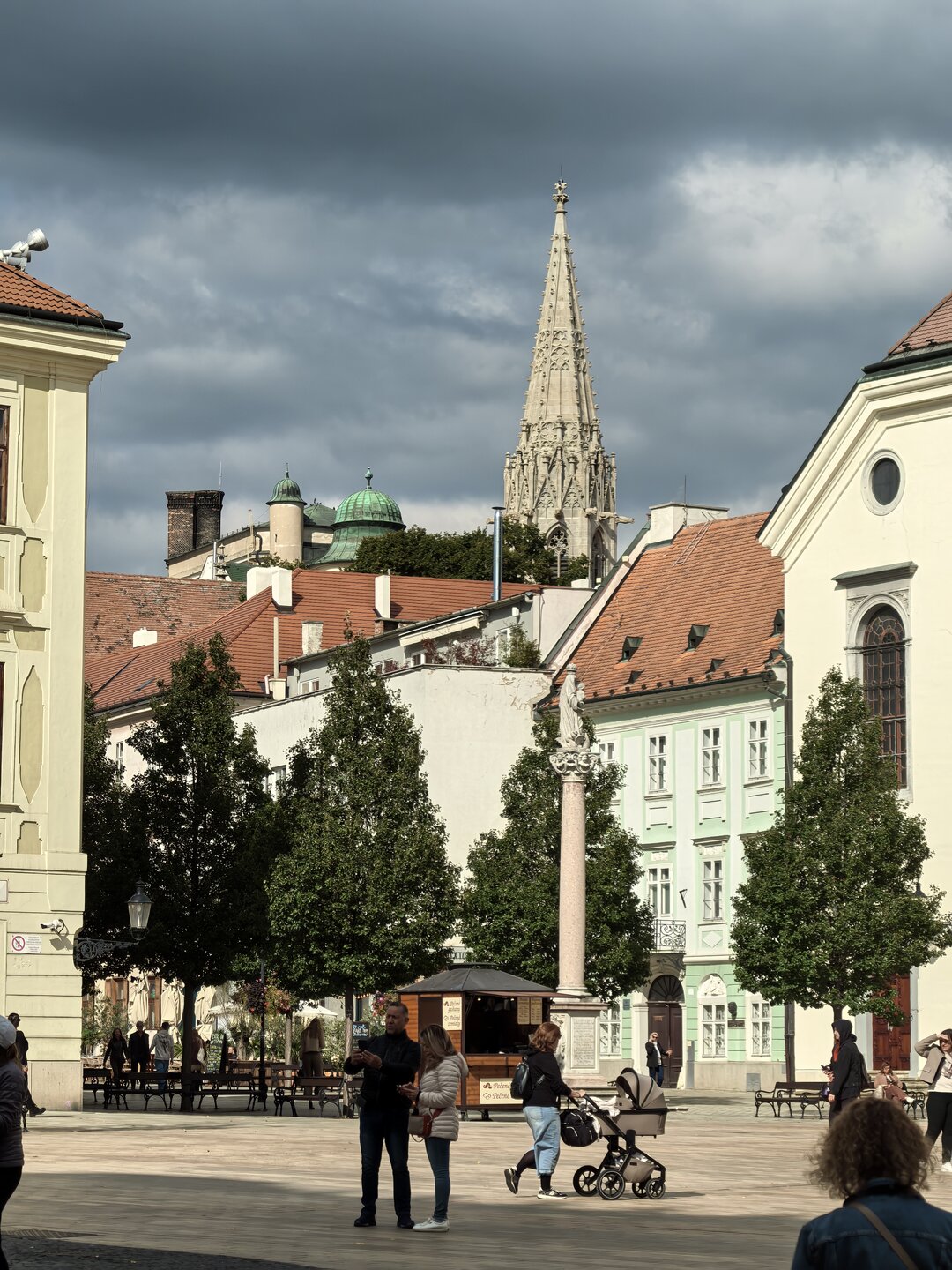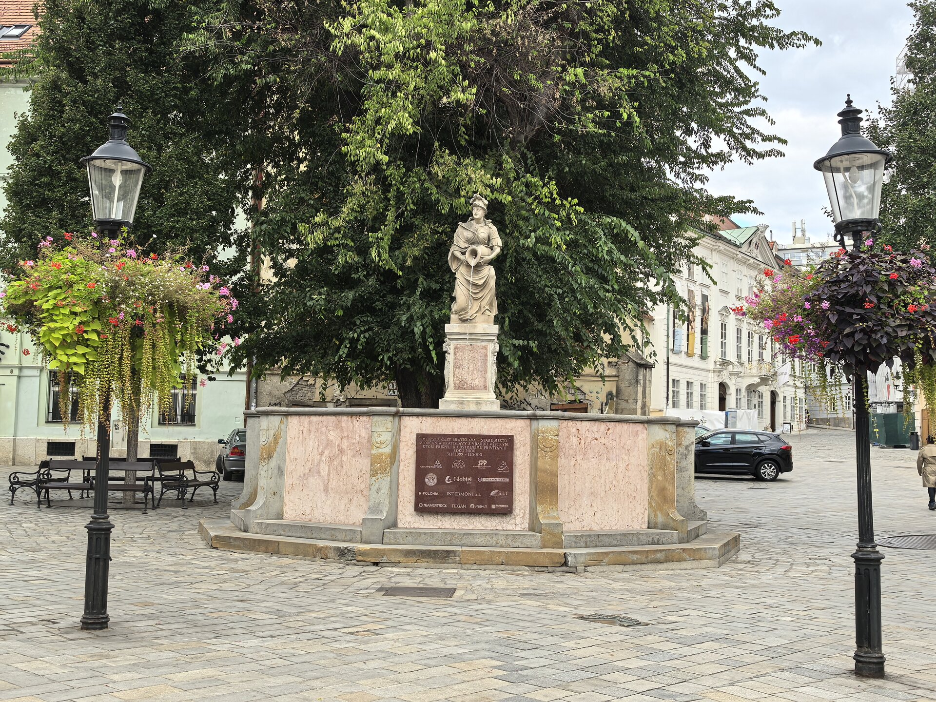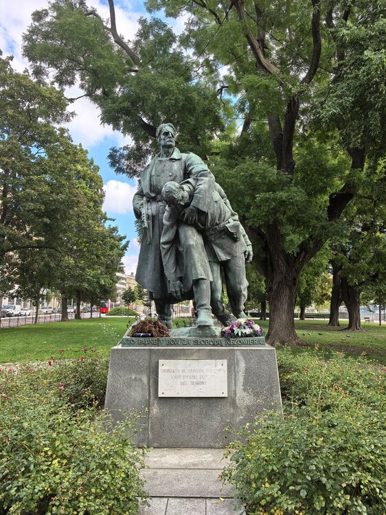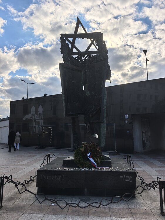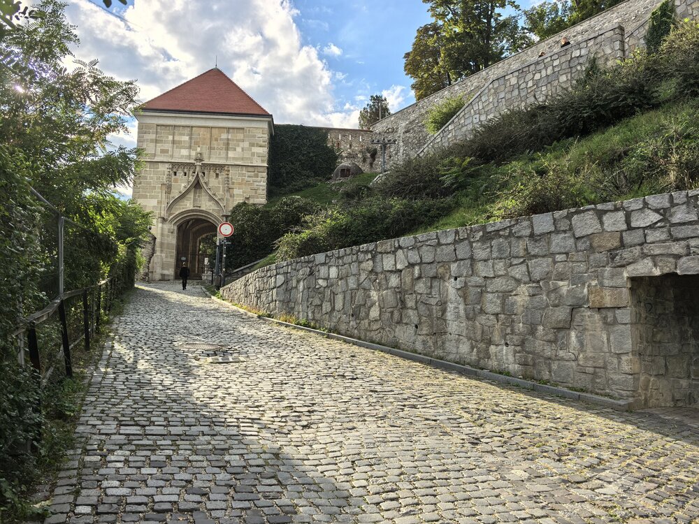 Конечно, нужно уже заглянуть в сувенирки... и знаете что?... Почти все товары похожи на венские сувениры, только надпись Братислава. Эх... Поэтому новогодняя тема. Всё красиво, но из-за перевозки в самолете купить не решились. Мы идём дальше узкими средневековыми улочками, где мало туристов. По ощущениям это было так необычно - как будто ты телепортировался в какой-нибудь 17 век и сейчас откуда-нибудь из-за угла вырулит карета с двойкой лошадей. Наверху мы уже видим Братиславский град. Мы выходим на ту же улицу, на которой стоит Национальный театр, только с другой стороны. Она тенистая и торговая, здесь несколько памятников, фотовыставка. Здесь бросается в глаза фонтан Девушка с оленем по сюжету сказки братьев Гримм "Братик и сестричка", который появился на этом месте в 1943 году. На фонтане выбито два имени. Скульптор, начинавший работу, не успел её закончить и скончался в 1940 году, а фонтан завершал уже другой человек. А это памятник Гансу Христиану Андерсону, который жил некоторое время в Братиславе. На плече у него сидит Оле-Лукое. Известна цитата Андерсона и Братиславе - «Žiadate ma, aby som vám porozprával rozprávku. Načo? Veď vaše mesto je rozprávkou!» «Просите, чтоб я рассказал Вам сказку? Но ведь Ваш город и есть сказка!» - и это правда. Ещё один чумной столб 18 века расположен на бывшей Рыбной площади. Чуть поодаль находится памятник холокосту и одновременно снесенной на этом месте Синагоге, изображение слева. И вот мы выходим к бывшим городским стенам. Старый город как бы встроен в неё, а вдоль стен проходит современная автомобильная дорога, отделяющая Старый город от Братиславского града. Рядом с остатками крепостной стены стоит огромнейший собор Святого Мартина. Собор начал строится в 13 веке на месте более древнего храма и... кладбища.. С 1563 года по 1830 являлся храмом для коронации императоров Священной Римской империи и Австро-Венгрии на трон Венгрии. Здесь была коронована Мария Тереза к примеру. Использовался и для музыкальных событий, здесь звучал Гайдн и Лист. А мы начинаем своё восхождение к Братиславскому граду, и чем выше, тем интереснее виды. Дорога на холм не крутая, но достаточно упорная. Особенно после нашего плотного обеда 😂 Мы выходим к стенам града со стороны Парламента, у которого развивается не только огромный флаг, но и флаги демонстрантов поменьше. Не стала снимать происходящее, тк нет понимания как отреагировала бы полиция. Хотя по надписи они должны быть и хорошими ребятами. Помогать и хранить.