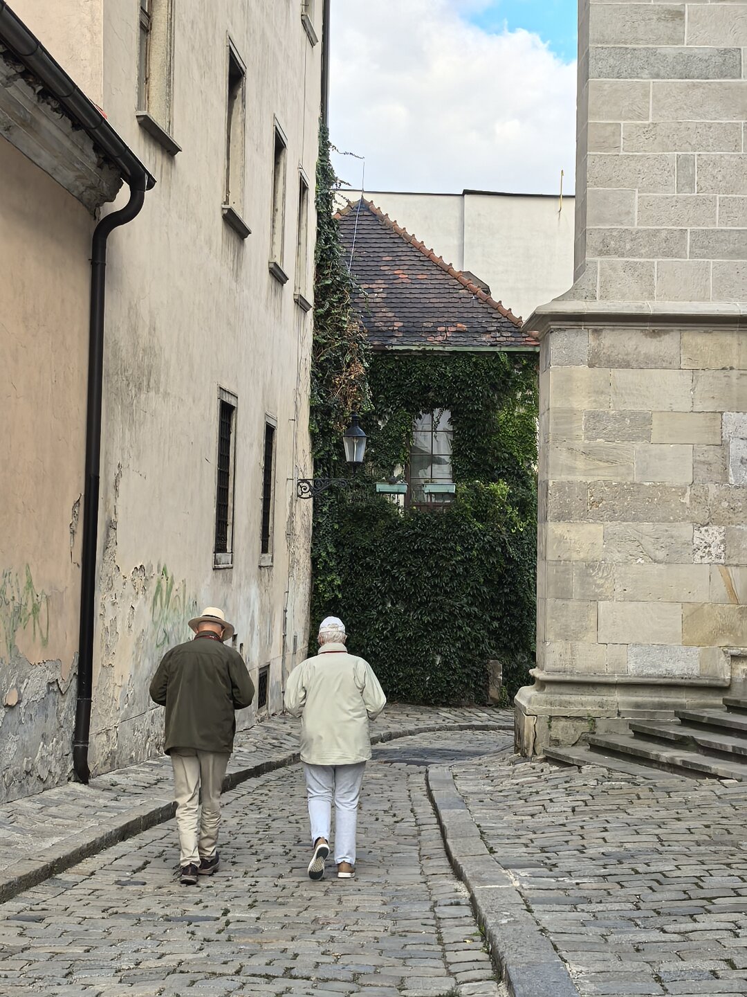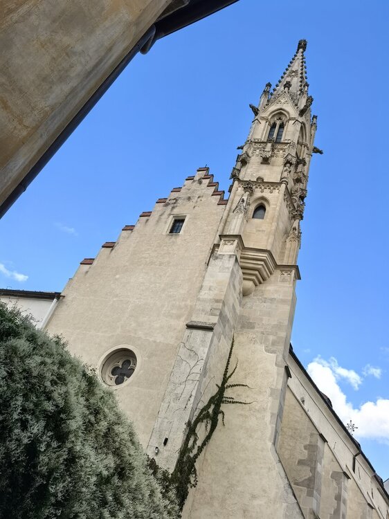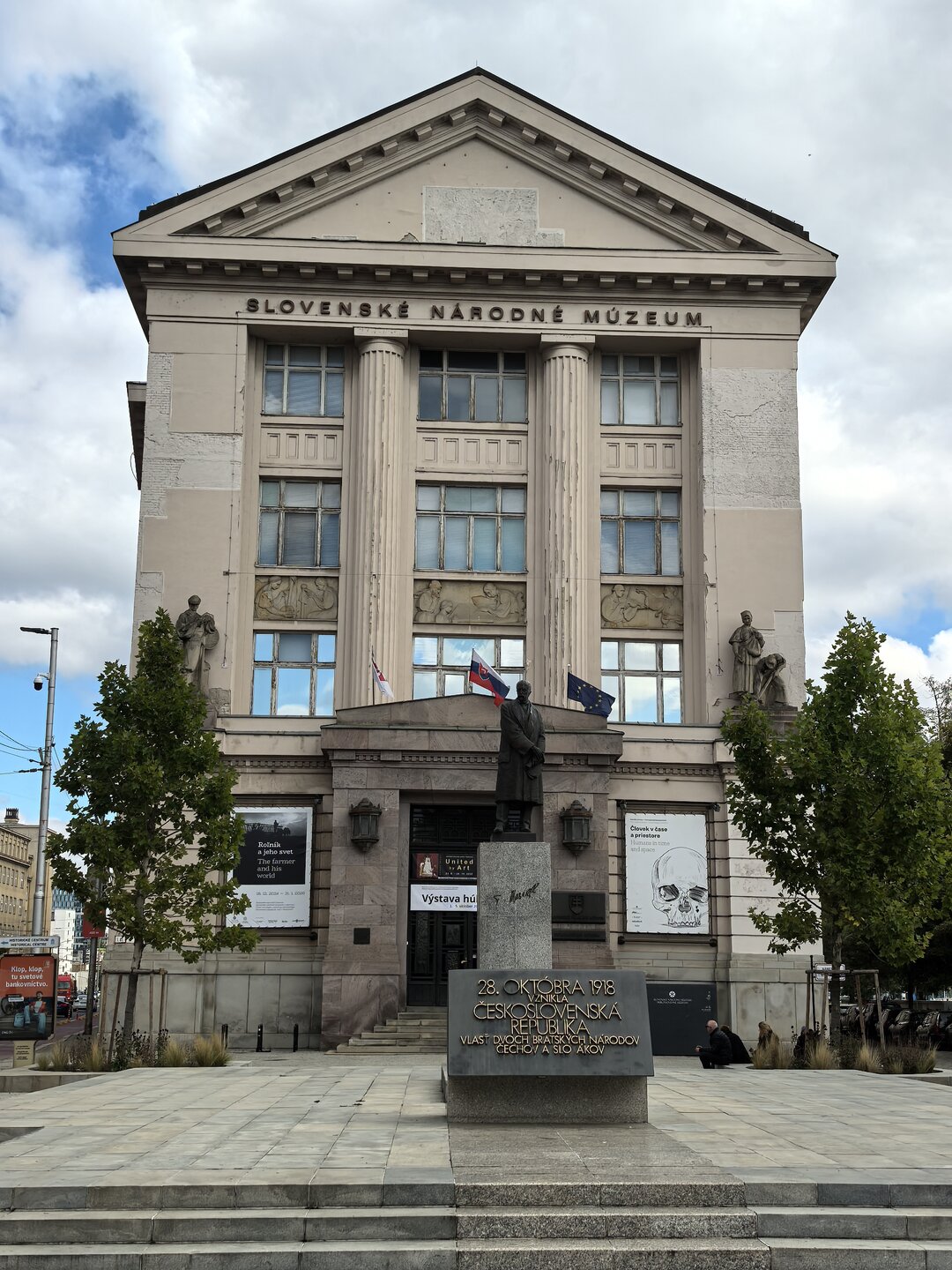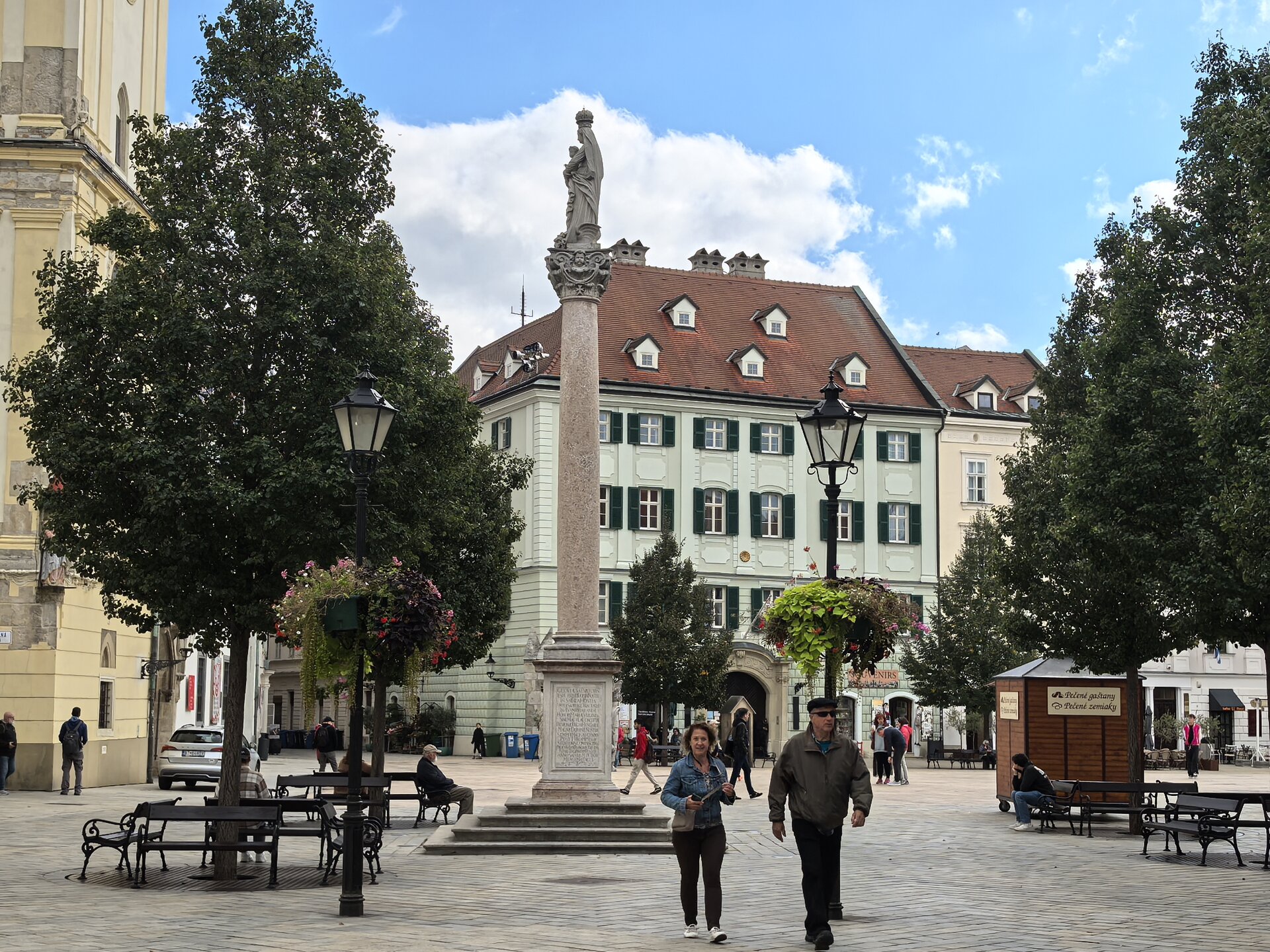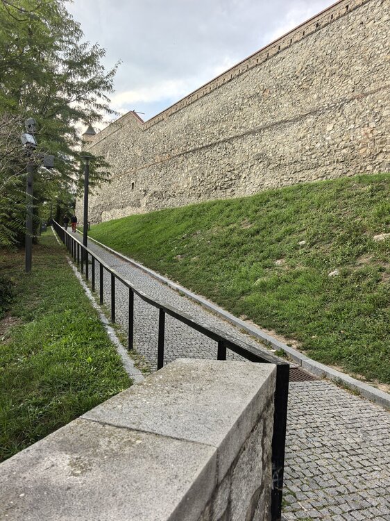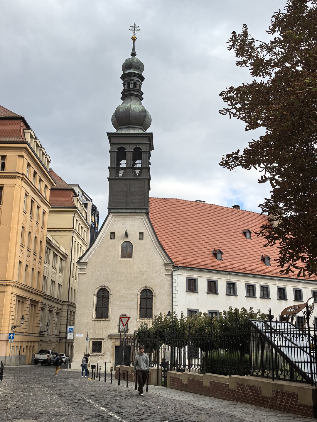 Конечно, нужно уже заглянуть в сувенирки... и знаете что?... Почти все товары похожи на венские сувениры, только надпись Братислава. Эх... Поэтому новогодняя тема. Всё красиво, но из-за перевозки в самолете купить не решились. Мы идём дальше узкими средневековыми улочками, где мало туристов. По ощущениям это было так необычно - как будто ты телепортировался в какой-нибудь 17 век и сейчас откуда-нибудь из-за угла вырулит карета с двойкой лошадей. Наверху мы уже видим Братиславский град. Мы выходим на ту же улицу, на которой стоит Национальный театр, только с другой стороны. Она тенистая и торговая, здесь несколько памятников, фотовыставка. Здесь бросается в глаза фонтан Девушка с оленем по сюжету сказки братьев Гримм "Братик и сестричка", который появился на этом месте в 1943 году. На фонтане выбито два имени. Скульптор, начинавший работу, не успел её закончить и скончался в 1940 году, а фонтан завершал уже другой человек. А это памятник Гансу Христиану Андерсону, который жил некоторое время в Братиславе. На плече у него сидит Оле-Лукое. Известна цитата Андерсона и Братиславе - «Žiadate ma, aby som vám porozprával rozprávku. Načo? Veď vaše mesto je rozprávkou!» «Просите, чтоб я рассказал Вам сказку? Но ведь Ваш город и есть сказка!» - и это правда. Ещё один чумной столб 18 века расположен на бывшей Рыбной площади. Чуть поодаль находится памятник холокосту и одновременно снесенной на этом месте Синагоге, изображение слева. И вот мы выходим к бывшим городским стенам. Старый город как бы встроен в неё, а вдоль стен проходит современная автомобильная дорога, отделяющая Старый город от Братиславского града. Рядом с остатками крепостной стены стоит огромнейший собор Святого Мартина. Собор начал строится в 13 веке на месте более древнего храма и... кладбища.. С 1563 года по 1830 являлся храмом для коронации императоров Священной Римской империи и Австро-Венгрии на трон Венгрии. Здесь была коронована Мария Тереза к примеру. Использовался и для музыкальных событий, здесь звучал Гайдн и Лист. А мы начинаем своё восхождение к Братиславскому граду, и чем выше, тем интереснее виды. Дорога на холм не крутая, но достаточно упорная. Особенно после нашего плотного обеда 😂 Мы выходим к стенам града со стороны Парламента, у которого развивается не только огромный флаг, но и флаги демонстрантов поменьше. Не стала снимать происходящее, тк нет понимания как отреагировала бы полиция. Хотя по надписи они должны быть и хорошими ребятами. Помогать и хранить.