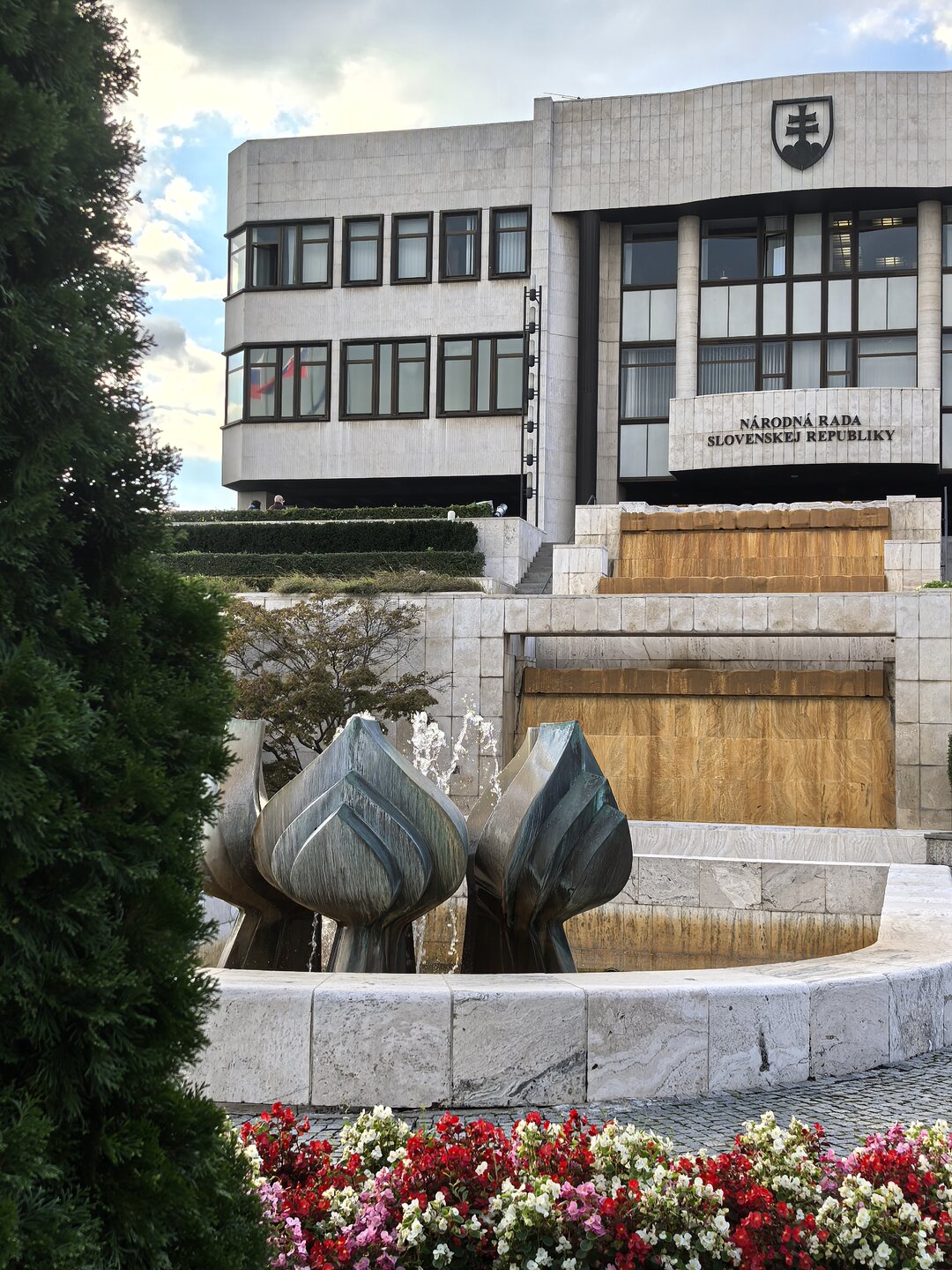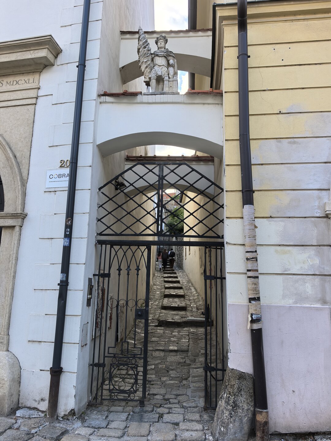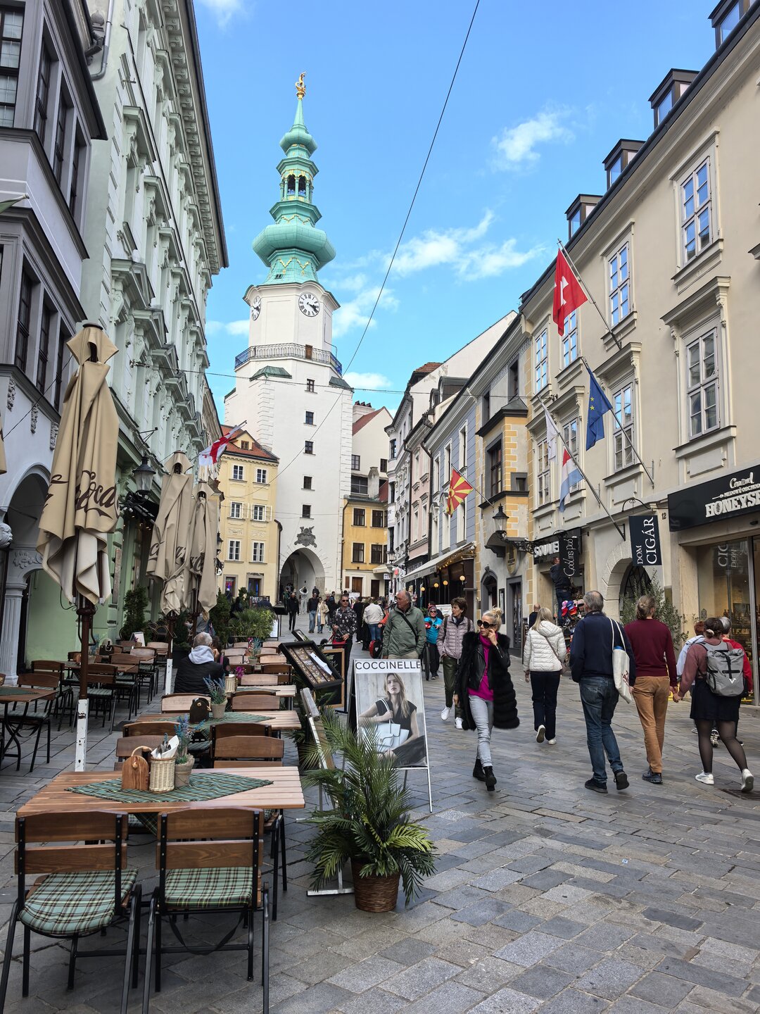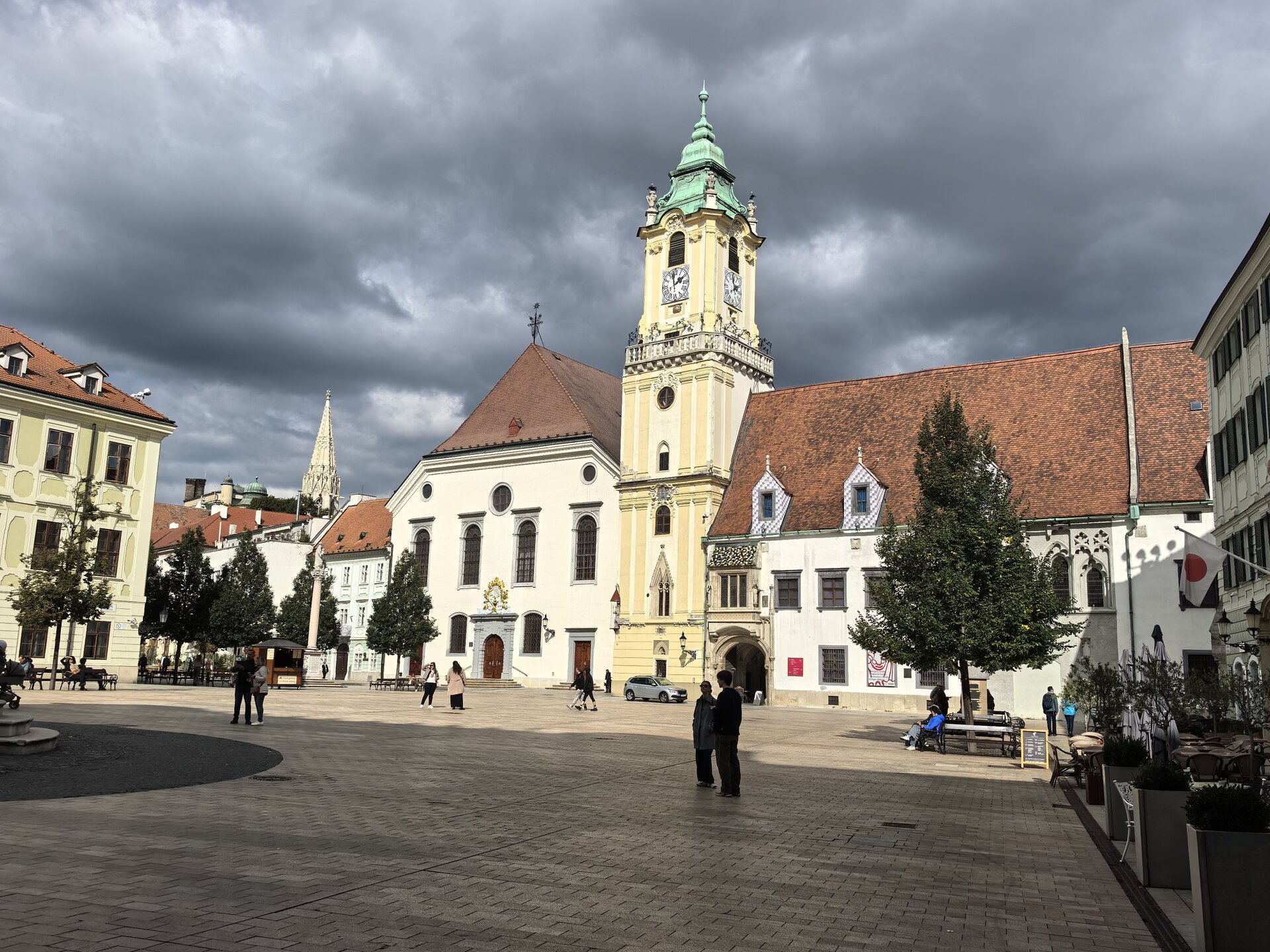 Конечно, нужно уже заглянуть в сувенирки... и знаете что?... Почти все товары похожи на венские сувениры, только надпись Братислава. Эх... Поэтому новогодняя тема. Всё красиво, но из-за перевозки в самолете купить не решились. Мы идём дальше узкими средневековыми улочками, где мало туристов. По ощущениям это было так необычно - как будто ты телепортировался в какой-нибудь 17 век и сейчас откуда-нибудь из-за угла вырулит карета с двойкой лошадей. Наверху мы уже видим Братиславский град. Мы выходим на ту же улицу, на которой стоит Национальный театр, только с другой стороны. Она тенистая и торговая, здесь несколько памятников, фотовыставка. Здесь бросается в глаза фонтан Девушка с оленем по сюжету сказки братьев Гримм "Братик и сестричка", который появился на этом месте в 1943 году. На фонтане выбито два имени. Скульптор, начинавший работу, не успел её закончить и скончался в 1940 году, а фонтан завершал уже другой человек. А это памятник Гансу Христиану Андерсону, который жил некоторое время в Братиславе. На плече у него сидит Оле-Лукое. Известна цитата Андерсона и Братиславе - «Žiadate ma, aby som vám porozprával rozprávku. Načo? Veď vaše mesto je rozprávkou!» «Просите, чтоб я рассказал Вам сказку? Но ведь Ваш город и есть сказка!» - и это правда. Ещё один чумной столб 18 века расположен на бывшей Рыбной площади. Чуть поодаль находится памятник холокосту и одновременно снесенной на этом месте Синагоге, изображение слева. И вот мы выходим к бывшим городским стенам. Старый город как бы встроен в неё, а вдоль стен проходит современная автомобильная дорога, отделяющая Старый город от Братиславского града. Рядом с остатками крепостной стены стоит огромнейший собор Святого Мартина. Собор начал строится в 13 веке на месте более древнего храма и... кладбища.. С 1563 года по 1830 являлся храмом для коронации императоров Священной Римской империи и Австро-Венгрии на трон Венгрии. Здесь была коронована Мария Тереза к примеру. Использовался и для музыкальных событий, здесь звучал Гайдн и Лист. А мы начинаем своё восхождение к Братиславскому граду, и чем выше, тем интереснее виды. Дорога на холм не крутая, но достаточно упорная. Особенно после нашего плотного обеда 😂 Мы выходим к стенам града со стороны Парламента, у которого развивается не только огромный флаг, но и флаги демонстрантов поменьше. Не стала снимать происходящее, тк нет понимания как отреагировала бы полиция. Хотя по надписи они должны быть и хорошими ребятами. Помогать и хранить.