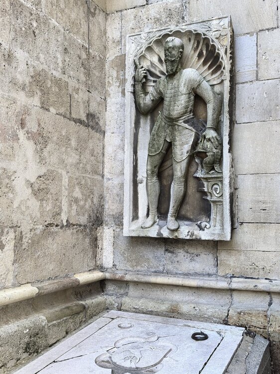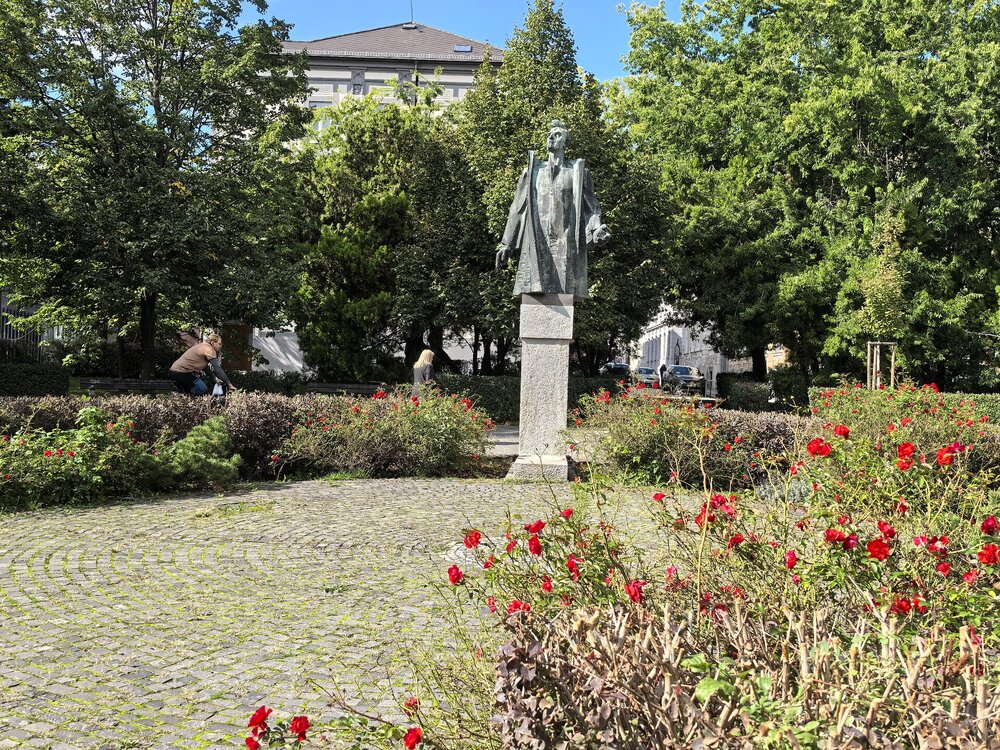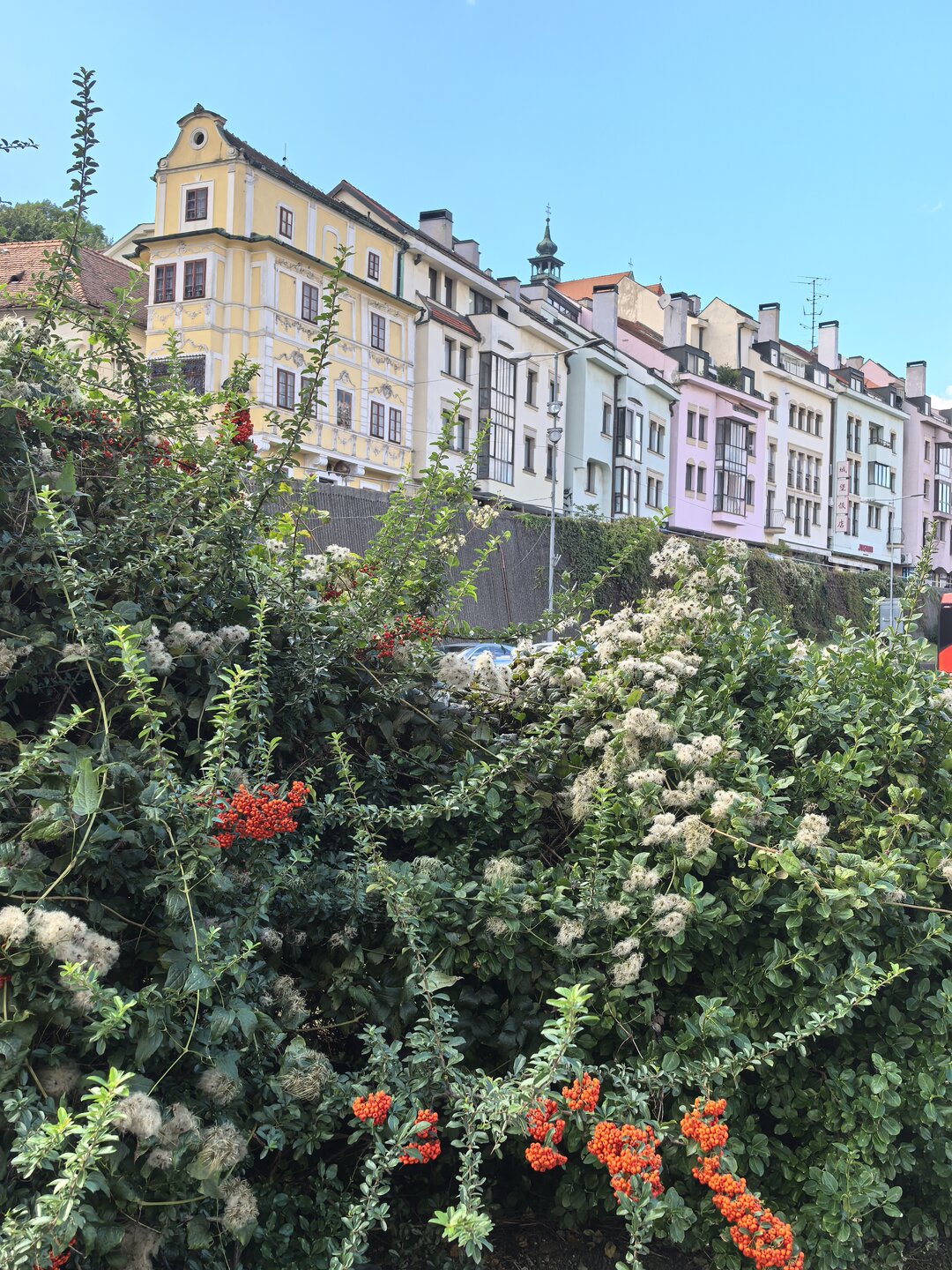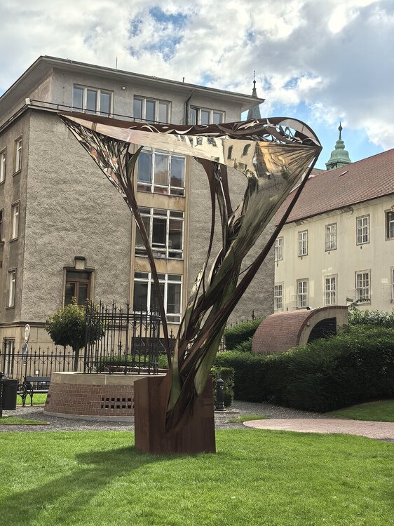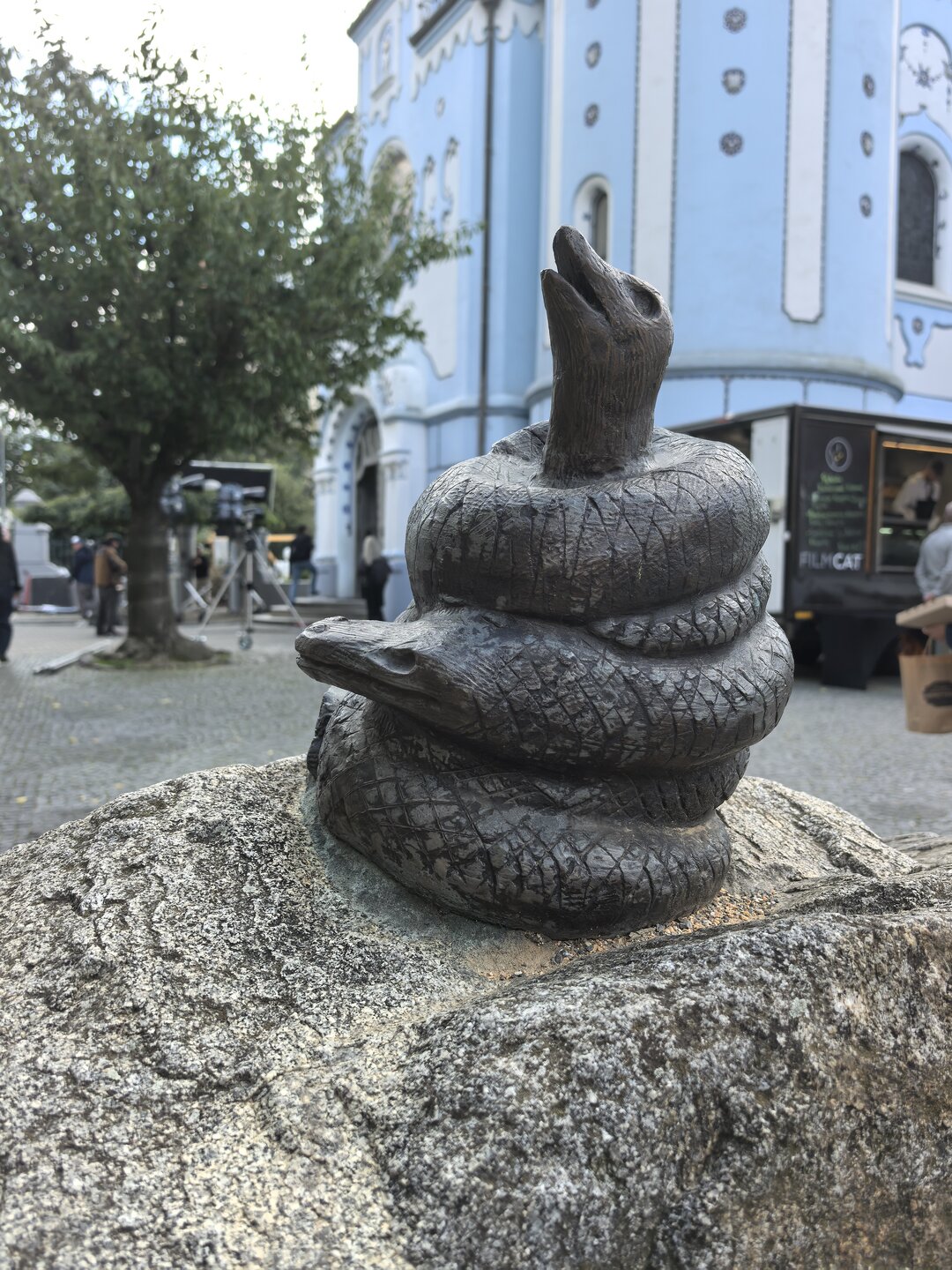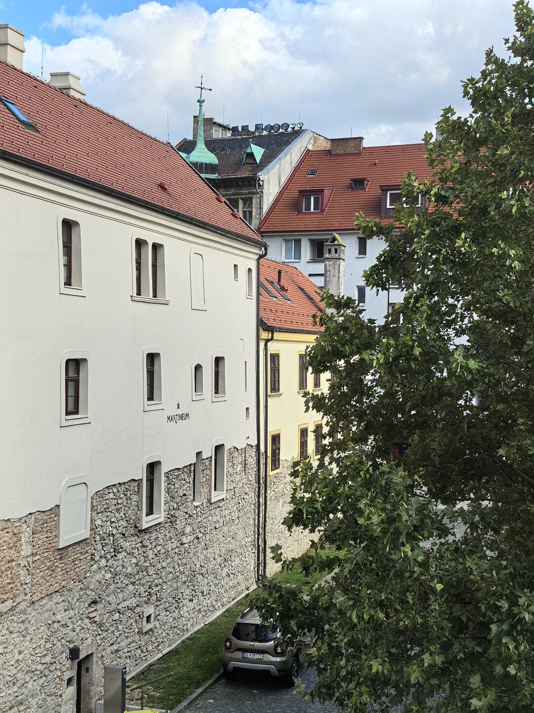Конечно, нужно уже заглянуть в сувенирки... и знаете что?... Почти все товары похожи на венские сувениры, только надпись Братислава. Эх... Поэтому новогодняя тема. Всё красиво, но из-за перевозки в самолете купить не решились. Мы идём дальше узкими средневековыми улочками, где мало туристов. По ощущениям это было так необычно - как будто ты телепортировался в какой-нибудь 17 век и сейчас откуда-нибудь из-за угла вырулит карета с двойкой лошадей. Наверху мы уже видим Братиславский град. Мы выходим на ту же улицу, на которой стоит Национальный театр, только с другой стороны. Она тенистая и торговая, здесь несколько памятников, фотовыставка. Здесь бросается в глаза фонтан Девушка с оленем по сюжету сказки братьев Гримм "Братик и сестричка", который появился на этом месте в 1943 году. На фонтане выбито два имени. Скульптор, начинавший работу, не успел её закончить и скончался в 1940 году, а фонтан завершал уже другой человек. А это памятник Гансу Христиану Андерсону, который жил некоторое время в Братиславе. На плече у него сидит Оле-Лукое. Известна цитата Андерсона и Братиславе - «Žiadate ma, aby som vám porozprával rozprávku. Načo? Veď vaše mesto je rozprávkou!» «Просите, чтоб я рассказал Вам сказку? Но ведь Ваш город и есть сказка!» - и это правда. Ещё один чумной столб 18 века расположен на бывшей Рыбной площади. Чуть поодаль находится памятник холокосту и одновременно снесенной на этом месте Синагоге, изображение слева. И вот мы выходим к бывшим городским стенам. Старый город как бы встроен в неё, а вдоль стен проходит современная автомобильная дорога, отделяющая Старый город от Братиславского града. Рядом с остатками крепостной стены стоит огромнейший собор Святого Мартина. Собор начал строится в 13 веке на месте более древнего храма и... кладбища.. С 1563 года по 1830 являлся храмом для коронации императоров Священной Римской империи и Австро-Венгрии на трон Венгрии. Здесь была коронована Мария Тереза к примеру. Использовался и для музыкальных событий, здесь звучал Гайдн и Лист. А мы начинаем своё восхождение к Братиславскому граду, и чем выше, тем интереснее виды. Дорога на холм не крутая, но достаточно упорная. Особенно после нашего плотного обеда 😂 Мы выходим к стенам града со стороны Парламента, у которого развивается не только огромный флаг, но и флаги демонстрантов поменьше. Не стала снимать происходящее, тк нет понимания как отреагировала бы полиция. Хотя по надписи они должны быть и хорошими ребятами. Помогать и хранить.