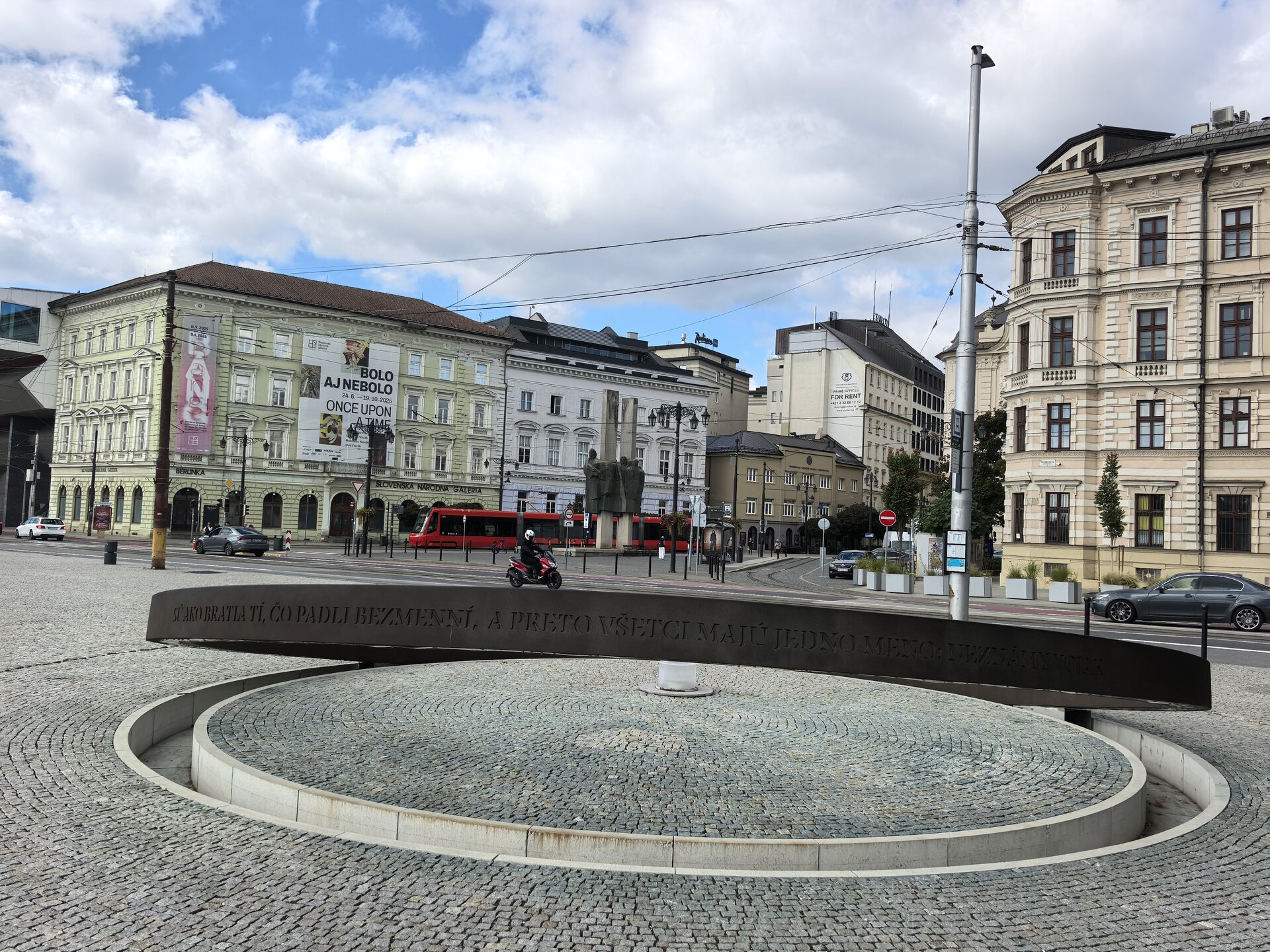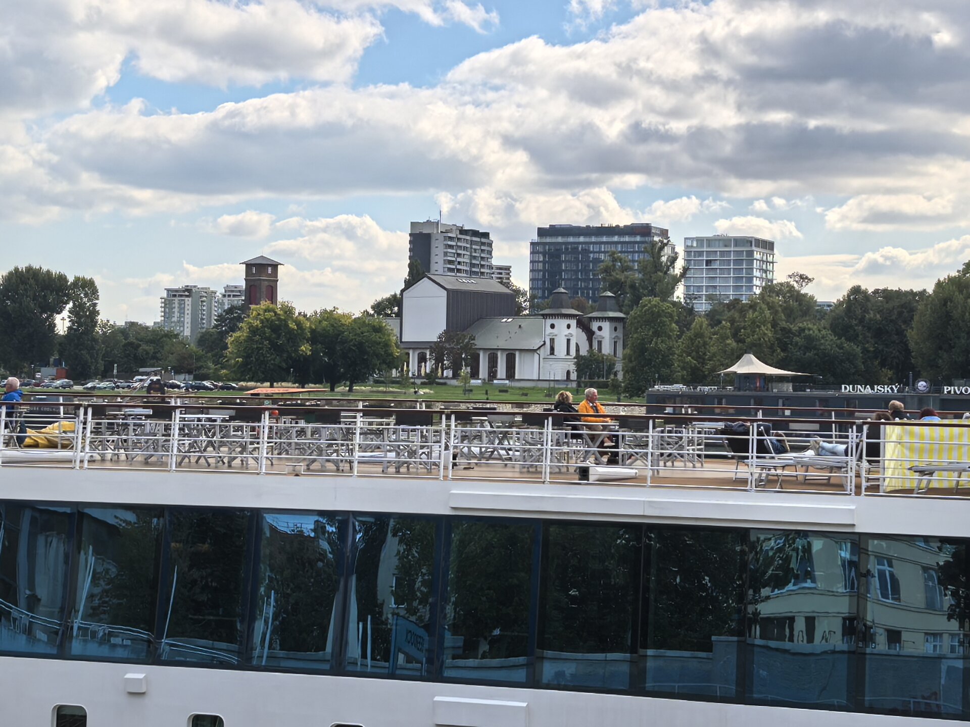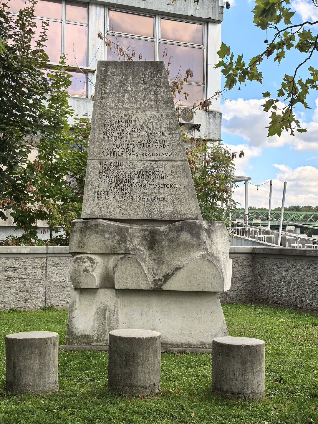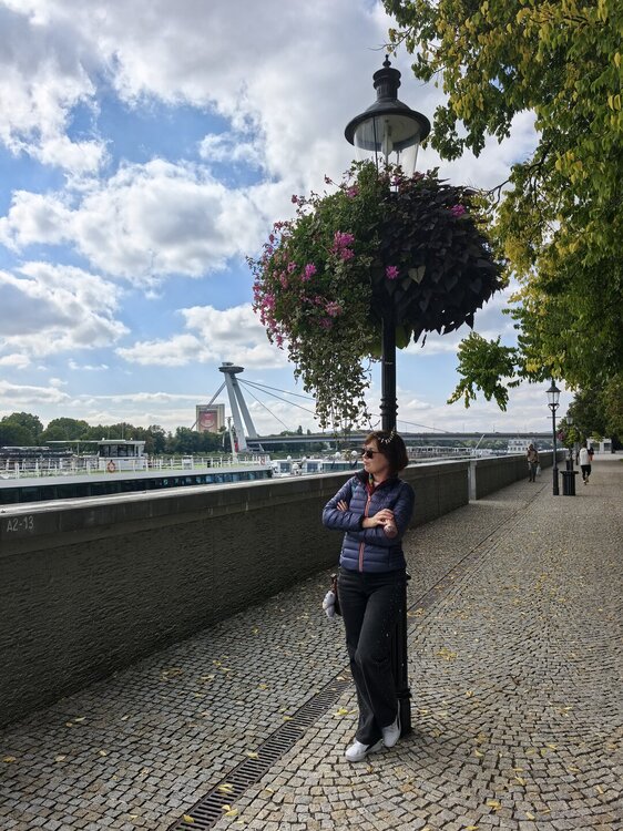 Ровно в 9:00 мы уже стояли перед дверью поезда на Братиславу. Никто ваших билетов не проверяет, заходите, садитесь :) Дверь открывайте тоже сами - прямо как в метро. Вот эти жёлтые бумажки наверху означают места следования пассажиров. Мы бы и внимания не обратили на это, если бы женщина не спросила правильно ли она понимает, что это подписан пункт назначения)) Мне сразу стало жалко кондукторов - написать от руки все эти бумажки и расставить по местам, то ещё "удовольствие". Ехали мы через Вишеград. Когда-то в январе 20г года я смотрела с этого холма вниз на проезжающие поезда. А так выглядит платформа вокзала Вишеграда, рядом расположена небольшая церквушка В Братиславу мы приехали с 10-минутным опозданием. "Терпимо." - подумали мы. Город встречал солнцем, по улицам сновали редкие прохожие, мы достали карту и пошли в сторону Старого города через... набережную. Площадь Свободы. Очень красивый фонтан Дружбы, буквально 4 года он не работал. Фонтан построен в 1980 году в форме цветка липы, в диаметре 9 метров, вес 12 тонн, а впечатлений тонн на 45 минимум. Площадь очень просторная и строгая, её обрамляют здания Института. Часы в тылу торгового центра Выходим к, пожалуй, самой необычной церкви - Голубой или Святой Елизаветы, построенной венгерским архитектором в начале 20 века в стиле модерна. В этом городе вообще много модерна. Перед храмом стоит памятник нерожденным детям. Церковь была закрыта от посетителей, а вокруг что-то снимали к Рождеству. Если вдруг смотрите зарубежное тв, может, и увидите когда-нибудь её :) Вот она, магия кино - вокруг ещё лето, но в кадре рождественский прилавок. Просто городской парк Рядом с народным словацким музеем стоит памятник советским морякам и воинам Меж тем, мы уже вышли на набережную. Здесь стоит кораблик, на верхней палубе которого неспеша течет чья-то жизнь. Но мы вышли сюда ради этого вида Этот мост также называют НЛО, но официальное название мост Словацкого национального восстания, а шайба наверху - ресторан. Этот мост без единой опоры в Дунае построен в 1967 году. Памятник болгарским партизанам А это оригинальный памятник неизвестному солдату А через дорогу уже и старый город начинается, на это нам указывает вот такой бронзовый постамент, проецирующий Братиславу 18 века