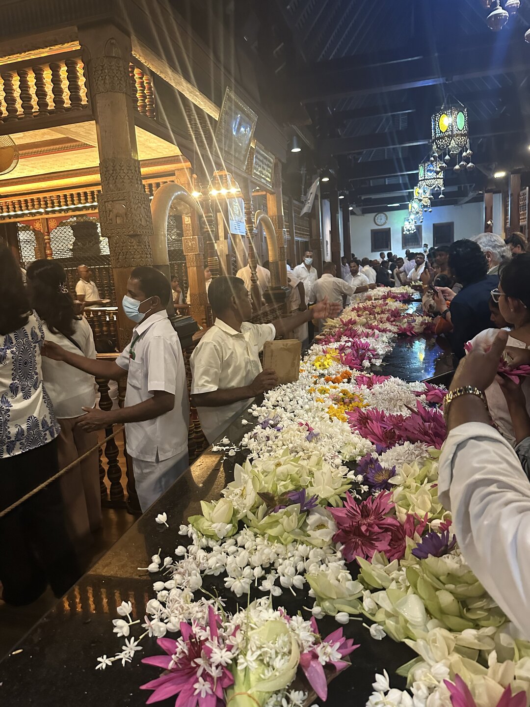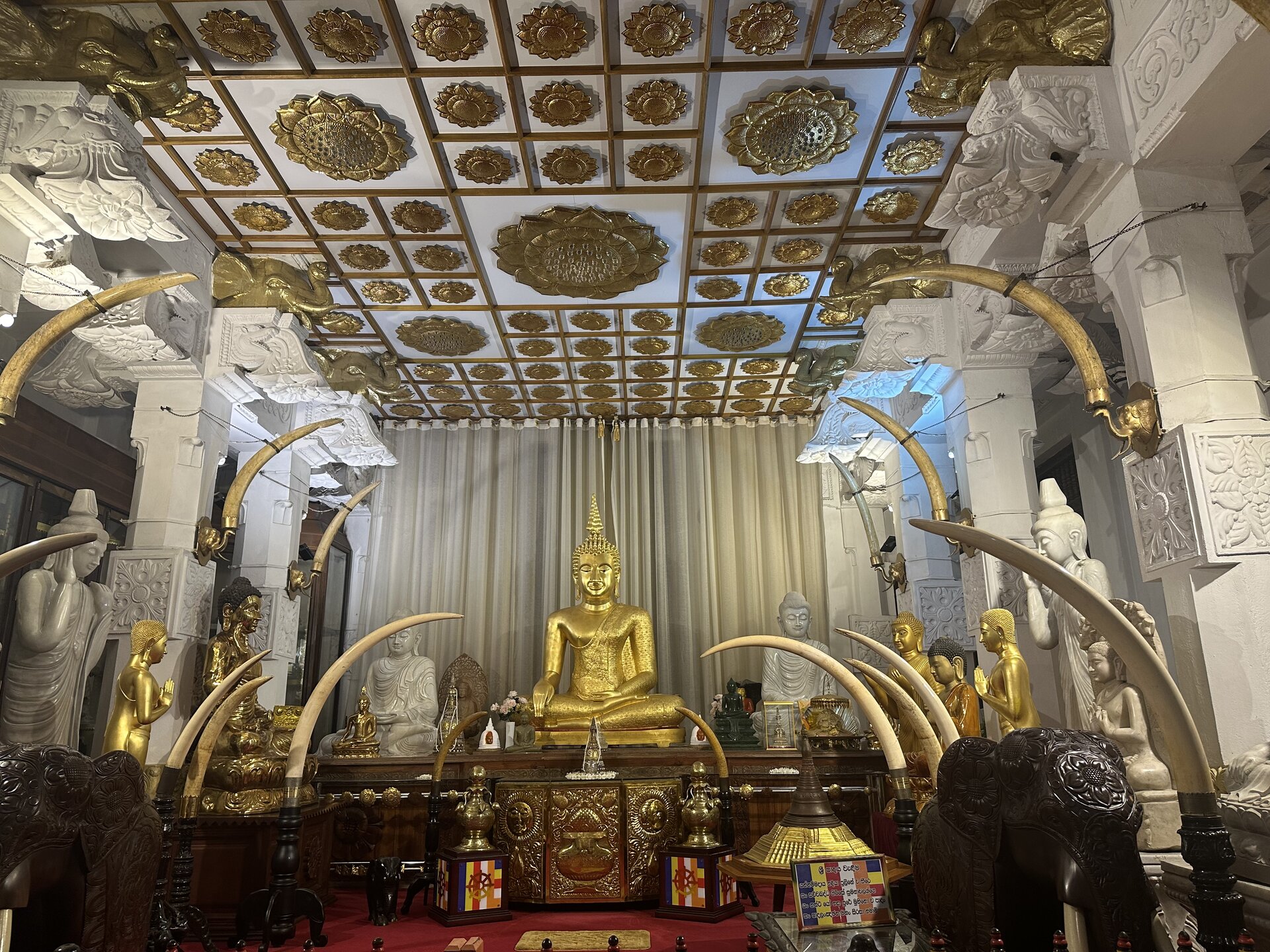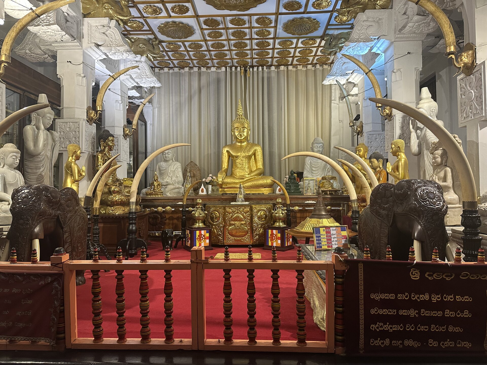Зуб 🦷 хранится в золотом ларце в форме ступы, в котором, как в матрешке, спрятаны еще 6 сундучков. Согласно буддийскому ритуалу зубу следует помолиться, умыться из специального чана, очиститься от грехов в благовонном дыме и метнуть несколько рупий к основанию купола. Чтобы все это увидеть, храм нужно посетить вечером, днём храм закрыт. Зуб 🦷 можно было сфотографировать только сильно издалека, поэтому что вышло, то вышло .. 😁