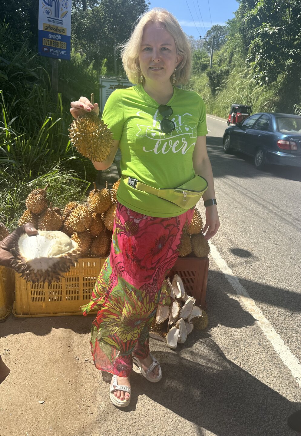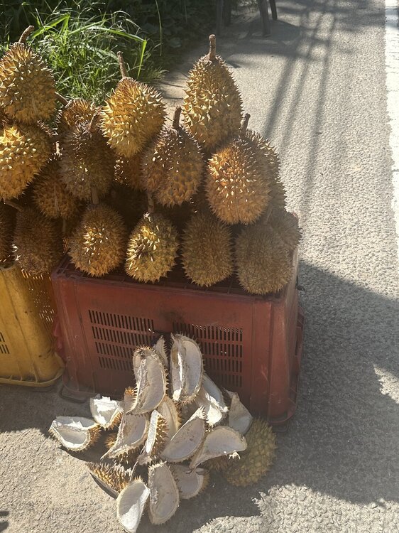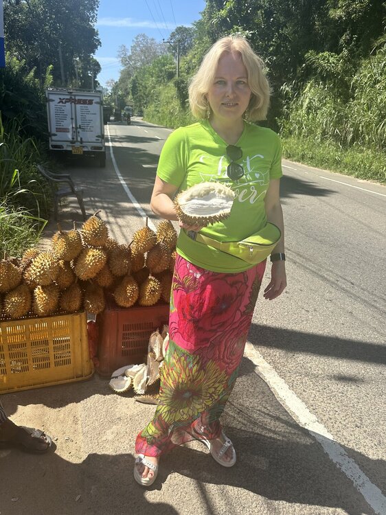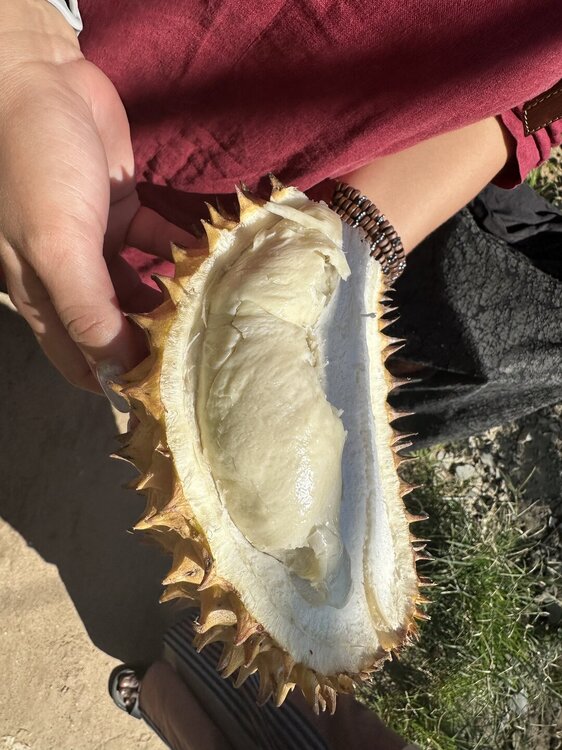 Настал черед попробовать тот самый самый полезный и одновременно самый вонючий 🦨 фрукт в мире - дуриан. Его нельзя провозить с самолете в багаже, в противном случае багаж провоняет тухлятиной, его также запрещено заносить в любые помещения по той же «ароматной» причине! На открытом воздухе он вроде бы как и не воняет, но! Вкус весьма специфический, и в нем присутствует легкий аромат того самого и белок! Ну такое себе… Считается, что каждый человек раз в жизни должен попробовать этот «чудесный» фрукт! Я попробовала, больше не хочу!