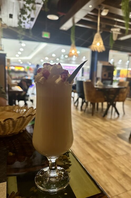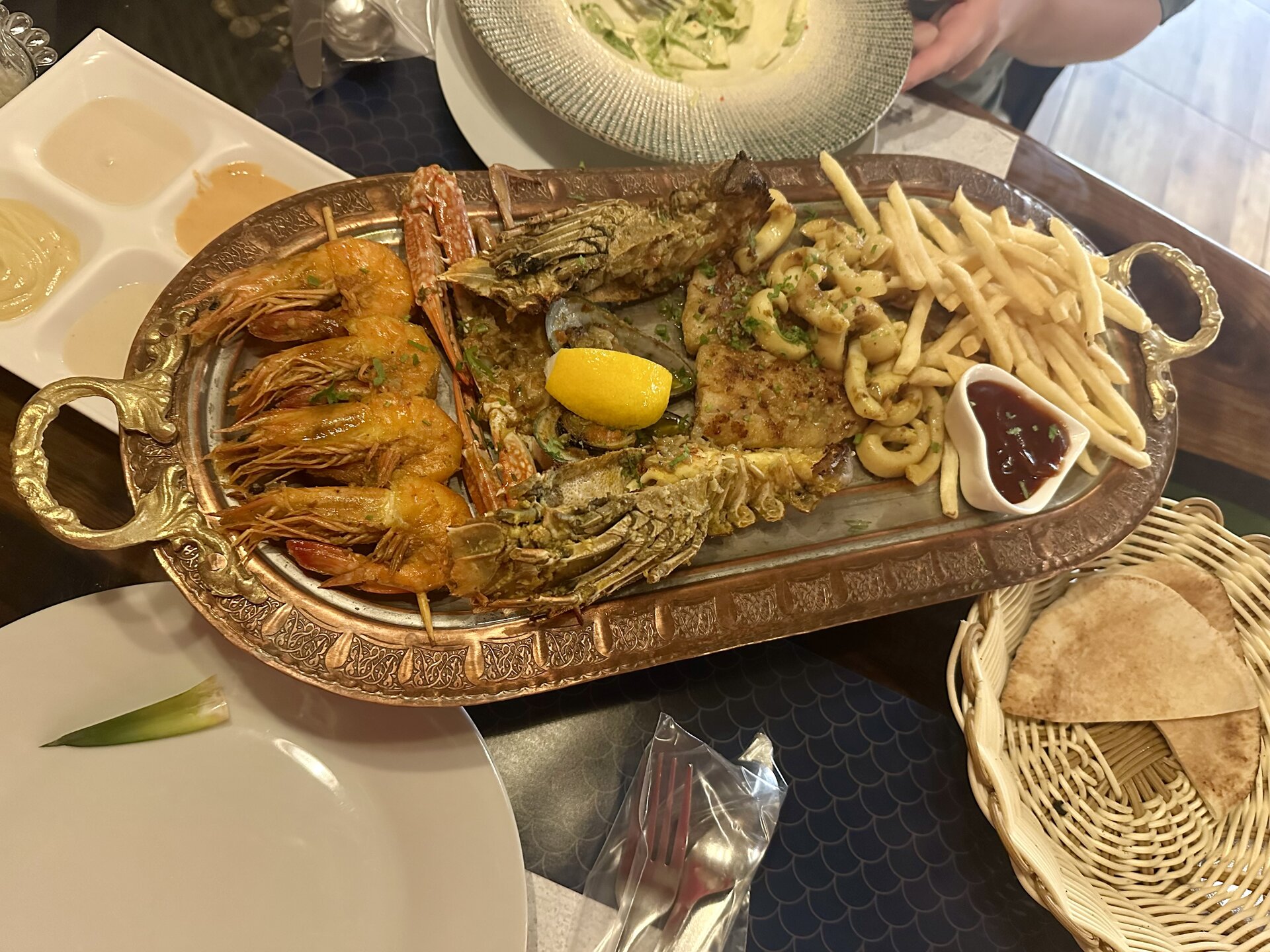 Теперь о еде! Тут все вкусно, кроме, пожалуй, традиционного арабского кофе с кардамоном, который по-сути представляет собой очень слабый не прожаренный кофе, возможно даже растворимый … Блюда тут так сильно не перчат, как в Азии, любят нут и хумус, прекрасно готовят итальянскую кухню, но с ягнятиной , так как свинина под запретом. Алкоголь тоже запрещен вплоть до уголовного преследования, зато все безалкогольные коктейли очень вкусные . Нормальный привычный нам эспрессо и капучино тоже есть , очень вкусный ! Из местных фруктов, повторюсь, только финики. Все остальное - привозное. Привычные нам супермаркеты есть, цены, ааа у нас, плюс минус . В ресторанах цены от 10 до 30 долларов . Мы в своем рыбном больше 20 долларов ни разу не проели ! IMG_7796.mov