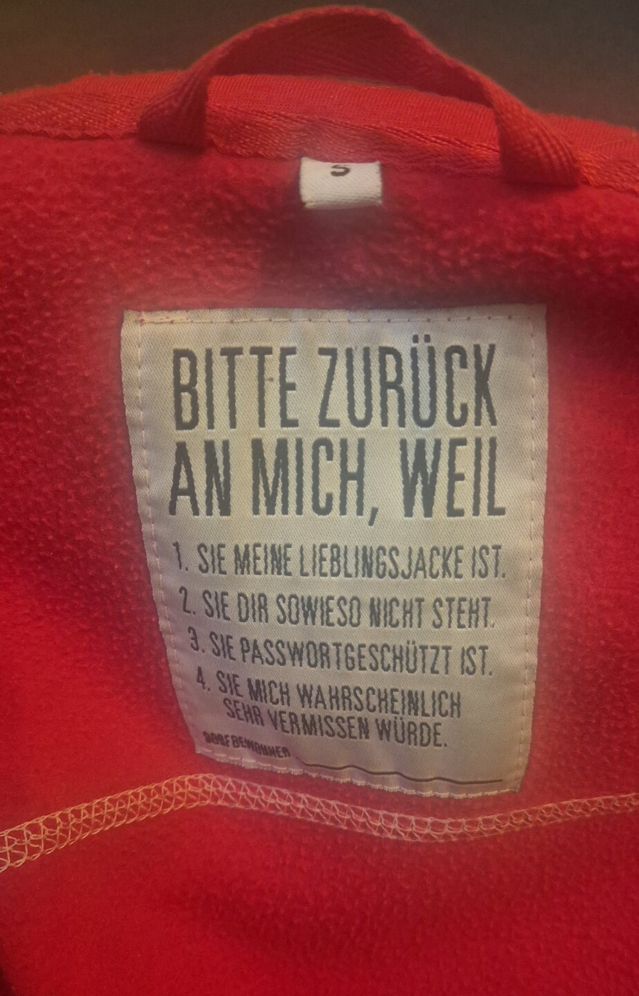 Перебирала я вещи в не очень хорошем настроении. И попалась мне тут куртка. Очень мило, я считаю) Заставило улыбнуться)) Верните эту вещь мне, пожалуйста, т.к. 1. это моя любимая куртка, 2. тебе она всё равно не подходит, 3. она защищена паролем, 4. ей, вероятно, будет меня очень нехватать. Хорошо относись к ней и она будет тебе благодарна. В рекомендациях по уходу советуют есть много клубники и быть счастливым и довольным))