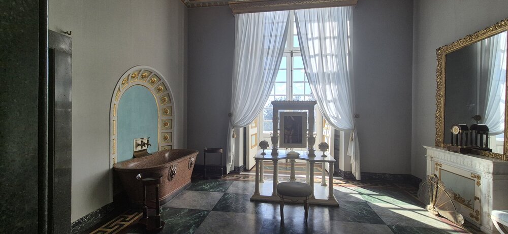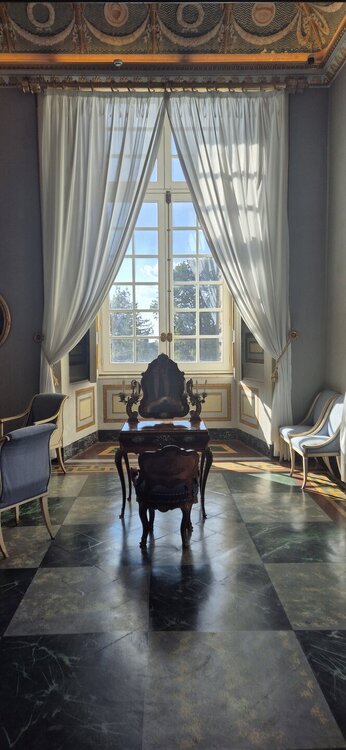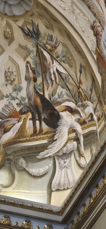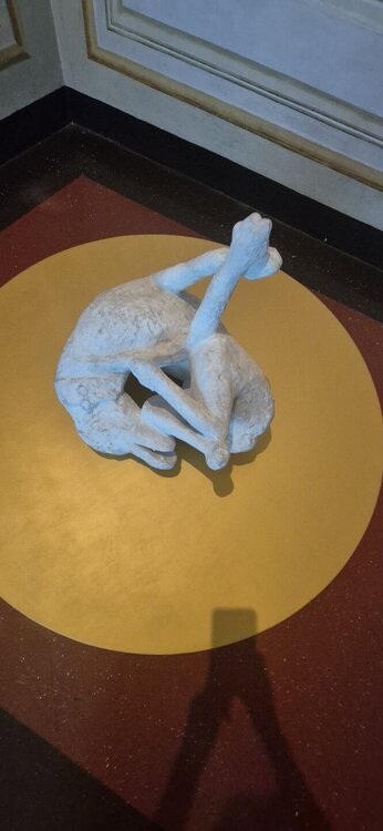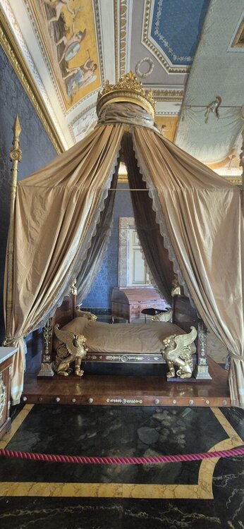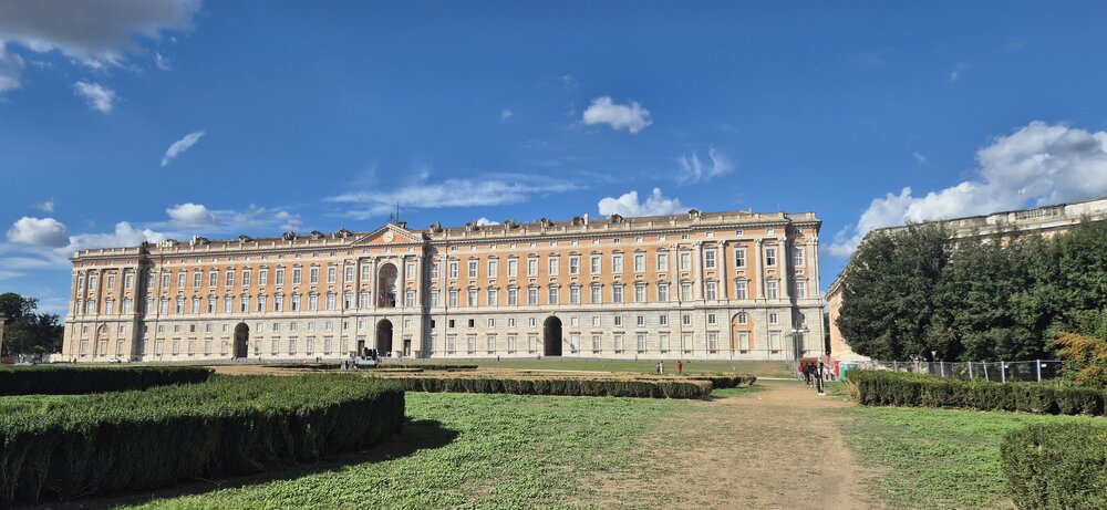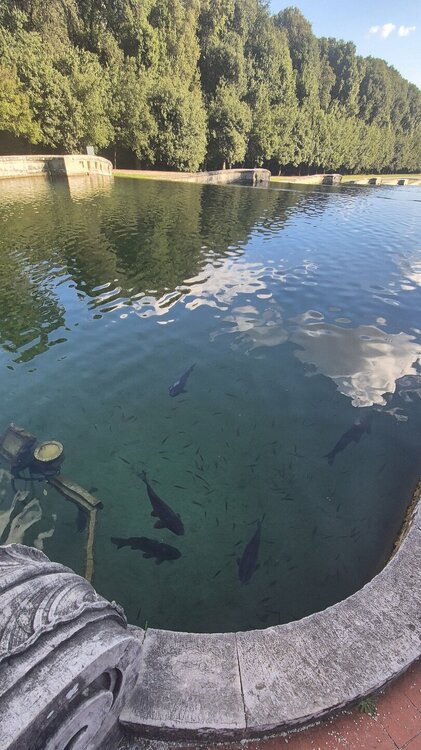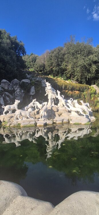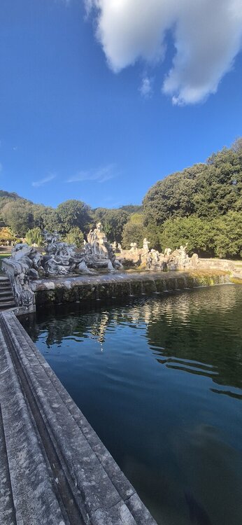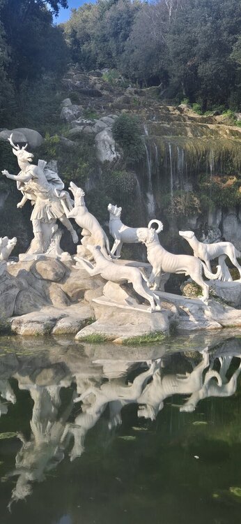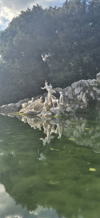 День следующий начался с капуччино по завтраковому талончику! В 12 у меня был телефонный разговор, поэтому надо было мне куда-то 2 часа до 12 потратить. В понедельник в Салерно рынок-таки был. Но такой скромный. Даже без вагончика с грилем. А я как-то (из-за жары?) бдительность потеряла, что даже купила салями домой в упаковке, а колбасе той до конца срока годности лишь месяц оставался. И креветок 500 грамм купила. И лимон к ним. Несу покупки на базу, и что-то оно подванивает. Или, может, кажется мне... Дома открываю мешок с креветками, беру одну, тут у нее башка- то и отвалилась. Ну и запах такой- на грани легкой- найлегчайшей тухлинки. Вот почему, оказывается, у этого недобросовестного продавца креветки там в корыте с водой лежали, а не привычной мне горкой на льду... В итоге эти 500 грамм креветок закончили свое существование в унитазе. Я разозлилась, у меня же теперь лимон неприкаянный лежит, на другой день в 7 утра уже была в найденном в Google рыбном магазине с шикарными отзывами, купила там 800 грамм роскошных креветосов. Они, правда, в 2 с лишним раза дороже тех отстойных были) Но, действительно, роскошные. Пока вернусь снова в день предыдущий. В 12:30 я освободилась и начала думать, куда я хочу. Помпеи! Это же рядышком совсем!! Но тушка моя совершенно не горела желанием несколько часов шастать по развалинам и плавиться на солнце. Тут я ещё и в интернете видео нашла любительское оттуда, на основании которого я сделала вывод, что без экскурсовода посещение Помпей будет весьма блеклым. А на темп аудиогида у меня терпения не хватит. А может, смалодушничала я... Но, так или иначе, Помпей в тот раз не случилось. Ну, этот регион достоен, чтоб его снова посетить. Там ещё и Монтекассино относительно рядом, и у меня к нему отдельный интерес... Ладно, табло отправления жд вокзала приглашало меня в Аречи, Потенцу или Казерту. Выбрала я Казерту. Говорят, дворец королевский там мощный, и парк достойный. Грандиозный загородный дворец неаполитанских Бурбонов, как в интернете написано. 18 век. Тоже все это ЮНЕСКО объект. Во дворце солнце не будет меня донимать, а в парке же тенек, да? Если честно, то было оно в конце сентября уже и не так жарко, как в июле и августе, выше 32 температура не поднималась, но мне такое не нравится. Кстати, сейчас там классно, двадцать с хвостиком, но... Дворец рядом с вокзалом. Билет покупаю и иду окультуриваться. Последний раз я в Португалии в каком-то дворце была, успела уже подзабыть, что дворцы это не мое)) Да, большое пространство, много комнат... Но внутри отчаянно жарко, окна нараспашку, кондиционеров нет) Хожу, головой верчу, собачек небезуспешно ищу) А это копия пёсика помпейского. Парк огромный, 120 га. Можно на электромобиле там передвигаться, на велосипеде или на своих двоих, мой случай. 3 км до фонтана Дианы. Пока дошла, язык на плече. Блин, надо было в Помпеи, какая разница, где потно задолбаться) Фонтан, конечно, красивый тот, собаки изображены с любовью и уважением к ним, и даже с деталями интимными, что бывает очень не всегда. Дальше я еще по парку погуляла. Статуи, гроты там, более мелкие фонтаны... В итоге, уставшая от жары, покинула я этот дворцовый комплекс и отправилась на осмотр города Казерты. Ну такой себе город. Вот Паола была крута, да, а тут не так и много старины. На центральной площади какой-то митинг палестино- израильский имел место быть. С десяток ак