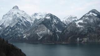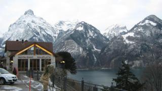 Отель расположен на крутом обрыве прямо над озером...Внизу у самой воды стоит часовня в память о деяниях национального героя Швейцарии Вильгельма Телля...Я уже предвкушал, как спущусь к этой часовне, запечатлю на фото и загадаю вам потом какую-нибудь загадку об этом месте...Но, увы, спуск и подъем по обледенелому серпантину занял бы у меня гораздо больше времени, чем я мог предположить, если вообще был возможен...