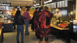 Скромно отведав на 27 франков яств швейцарских, расслабились было здесь же на залитой солнцем террасе, но вдруг заприметили вошедшую компанию добрых молодцев в необычных нарядах, и разом смекнув, что вот это, видать, и есть "выходной" день карнавала, быстренько заспешили на улицу...