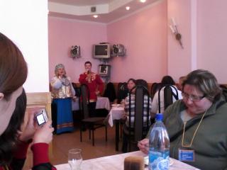 Затем в местном Переславском кафе "Встреча" организаторы устроили нам праздник с "тамадами" из ансамбля русской народной песни. Надо сказать, что в начале мы достаточно скептически отнеслись к такой "анимации" встречи, но потом так сами завелись, что и пели и танцевали, хороводы водили, в конкурсах участвовали. Я проиграла в конкурсе с машинками, позор на мою автомобильную голову, но приз мне все равно вручили. Конечно благодаря нашим супер активным девушкам болельщицам во главе с Татьяной. Спасибо девочки, одна из фотографий со встречи обязательно будет стоять в подарочной фоторамке: ТТВ-лучший! Да и кроме конкурсов, подарками нас всех задарили и организаторы, и форумчане. Вкусный евроцент съеден сынулей, говорит мало, значит пора готовить новую встречу. Татьяна, смотрю, уже вплотную этим занята, молодец, так держать! Было очень приятно познакомиться с семейством Сергея Ш, милой супругой и дочурой Мариночкой. Сразу видно молодого туриста, который и в конкурсе папе не уступит, и веселится, и не устает, умничка.