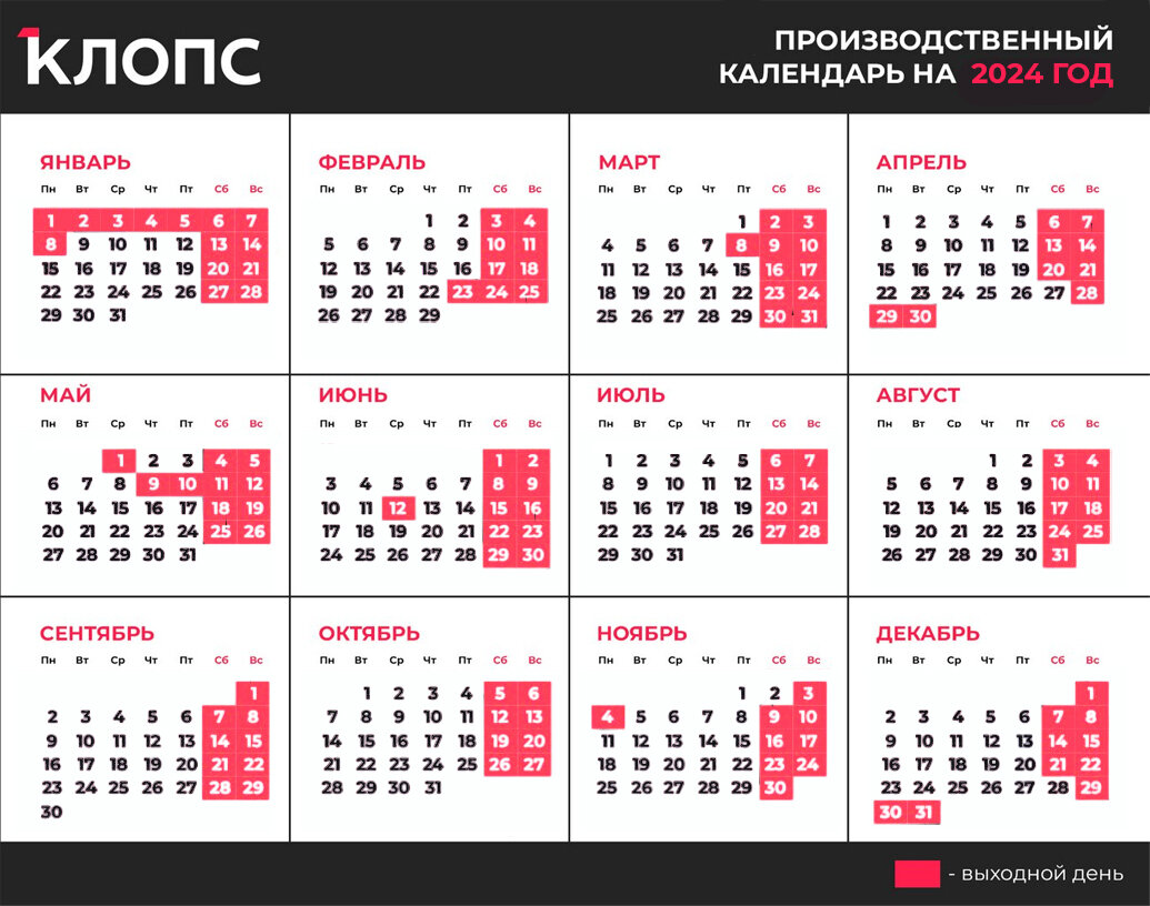 1. с 1 по 8 января 2024 г. (сами новогодние каникулы продлятся 10 дней и начнутся 30 декабря 2023 года);
