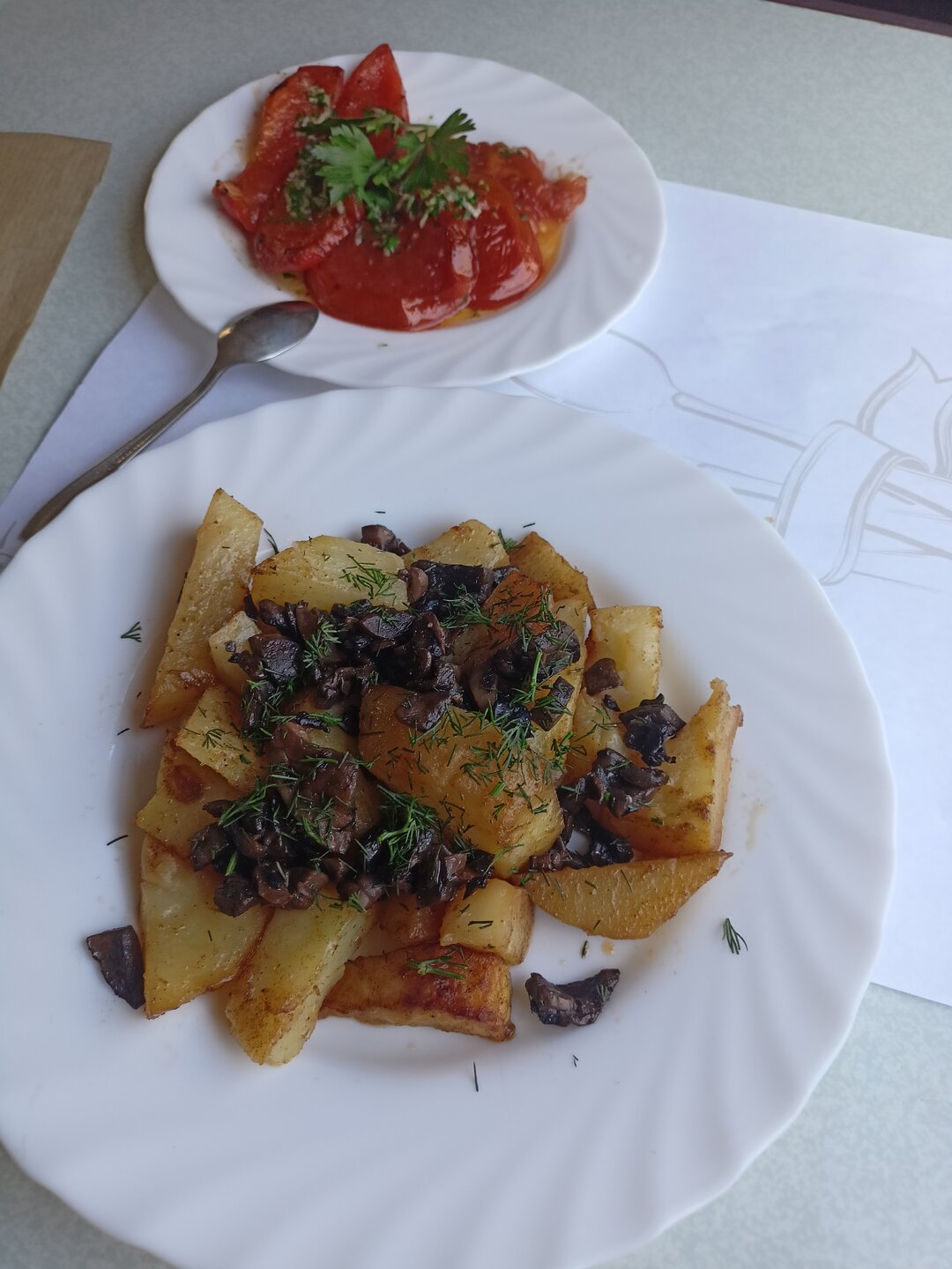 Салат овощной, картошка с грибами, томаты с перцем под маслом и запечённые - все было вкусно! Но , конечно, все приправлено русским матом от других столиков. Но когда слышишь мат от детей/школьников/студентов постоянно, то чего ожидать от мужчин под водочку) Им служители делали замечания, но когда это уже млова-связки ничего не сделаешь)