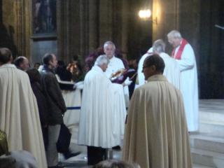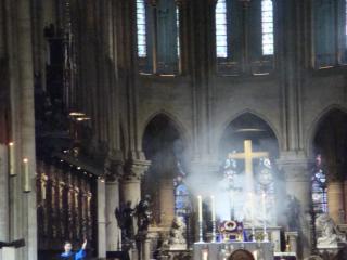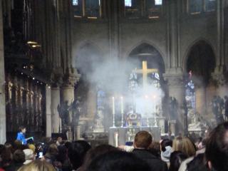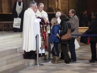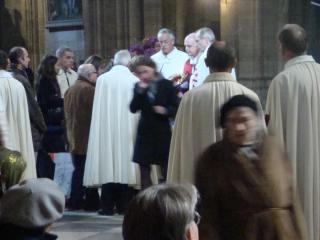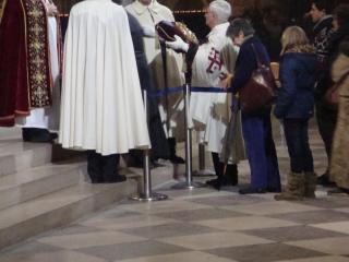 Опубликовано 11 ноября, 201213 г. Автор comment_263471 Я спрашивала у местного гида Людмилы реально ли попасть и много ли народу.Она сказала что народу бывает не больше ,чем обычно, т.к. туристы в большинстве своем не в курсе, если только кто из местных гидов не подскажет.И нужно прийти минут за 20 до выноса и показала откуда его будут выносить,где нужно встать в соборе, что бы увидеть венец близко.Предупредила что за ограждение для верующих лучше не заходить, а то придется остаться до конца службы,. т.к. все перекрывают. К Нотр Даму я подошла где-то 14-40. Народу на вход стояло очень много. Я сначала расстроилась, что не успею зайти. А потом пригляделась - очередь не стояла, а потихоньку все время двигалась. Я встала и успела зайти как раз перед выносом. Мудрить не стала, быстро прошла вместе с прихожанами на сидячие места за ограждением,и села у середины прохода.Оказалось очень удачно. Вся эта торжественная процессия в белых одеждах прошла как раз рядом со мной, так близко, что при прочих обстоятельствах я могла бы дотронуться до него рукой. Зрелище конечно было очень торжественное,В соборе играл большой орган, который играет только по большим праздникам. Опять замечательно пела та самая молодая женщина. С близкого растояния сделать фото не смогла,фотоаппарат в это время я не доставала, раз уж я села среди верующих, то посчитала не этичным вести себя как туристка.Венок пронесли к алтарю, достали из реликвария ( потрясающе красив, настоящее произведение искусства ) и торжественно возложили на красную бархатную подушку. Если увеличить фото, то можно попытаться его увидеть среди дыма ладана. А слева,в ярко синем, та самая девушка, что так чудесно пела во время службы.Фото сделала уже в конце, после того как мы вышли из за заграждения и приложились к венцу. Изменено 11 ноября, 201213 г. пользователем nita_ru Жалоба