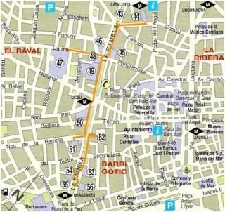 Опубликовано 8 февраля, 201312 г. comment_289412 Маршрут 4 Бульвар Ла Рамбла Название Ла Рамбла объединяет семь бульваров. Это - цепь бульваров, различающихся своим названием и характерными особенностями. Ближе к центру расположен Рамбла де Каналетес(43) с источником Каналетес, чья вода, по легенде, обладает волшебным свойством; попробовавший ее обязательно вернется в Барселону. Если спускаться по бульвару вниз, то слева будет улица Санта Анна, по которой можно выйти на площадь того же имени, где расположена небольшая церковь Святой Анны (44), великолепное творение в романском стиле XII века. Отрезок бульвара от улицы Санта Анна до улицы Портаферрисса носит название Рамбла делс Эстудис (Бульвар Учебы), так как здесь в средние века находился Университет (Эстуди Генерал). Ближе к улице Портаферрисса расположен птичий рынок. На левой стороне улицы находится Дворец Моха (45) (XVII век), яркий образец барокко. Прямо напротив, на другой стороне Рамблы можно увидеть церковь Вифлеема (46)в стиле барокко (ХVII-XVIII в.в.), чей фасад покрыт рустованными камнями. Свернув на улицу Карме, можно подойти к Госпиталю Санта Креу (Святого Креста) (47) (XV-XVI вв.). Это готическое здание с изящными стрельчатыми сводами, впечатляющей крытой галереей и красивым внутренним двориком в тосканском стиле. Сейчас здесь расположена Библиотека Каталонии. Отрезок бульвара, идущий от улицы Карме к улице Успитал, усаженный огромными платанами, известен как Рамбла де лес Флорс (Бульвар Цветов), так как вдоль него расположены цветочные киоски. В этой меняющейся вместе со временами года красоте заключена сама суть Барселоны. Наиболее примечательным в этой части бульвара является Дворец Виррейна (48), здание XVIII века в стиле, близком к стилю Людовика ХIV, где сейчас расположен городской выставочный центр. Но символом этого места является Рынок Бокерия (49), который не оставит равнодушным никого из посетителей. Здесь расположились десятки прилавков с овощами, мясом и рыбой. Здесь же можно выпить и перекусить в одном из баров. Дальше путешественник попадает на небольшую площадь Пла де ла Бокерия. Ее мостовая вымощена цветными камнями по проектуЖуана Миро в 1970 году. Украшением этого места является театр Гран Театре дел Лисеу (50), за чьим скромным фасадом расположился один из самых пышных и обширных театральных залов мира. Цепь бульваров продолжает Рамбла делс Капучинс. Справа расположенОтель Ориенте, который занимает здание бывшего Колледжа Святого Бонавентуры (XVII век); сохранился архитектурный ансамбль монастыря с его крытой галереей. Чуть ниже проходит улица Ноу де ла Рамбла, где можно увидеть Дворец Гуэль (51), объявленный ЮНЕСКО Достоянием Человечества. Это здание с фасадом из белого камня и параболическими арками у входа было построено Антонио Гауди. Справа открывается Plaça Reial (52) - прямоугольная, с колоннадой, построенная в середине XIX века, окруженная зданиями с простой архитектурой. Здешние фонари - юношеская работа Антонио Гауди. На площадь выходят магазинчики, в которых, как кажется, остановилось время; самый необычный из них - Эрболари дел Рей (Королевский Гербарий), лавка трав и растений, сохраняющая характер эпохи романтизма, украшенная неоготическими витринами. По воскресеньям на площади разворачивают свой рынок филателисты и нумизматы. Площадь Пла дел Театре составляет следующий отрез