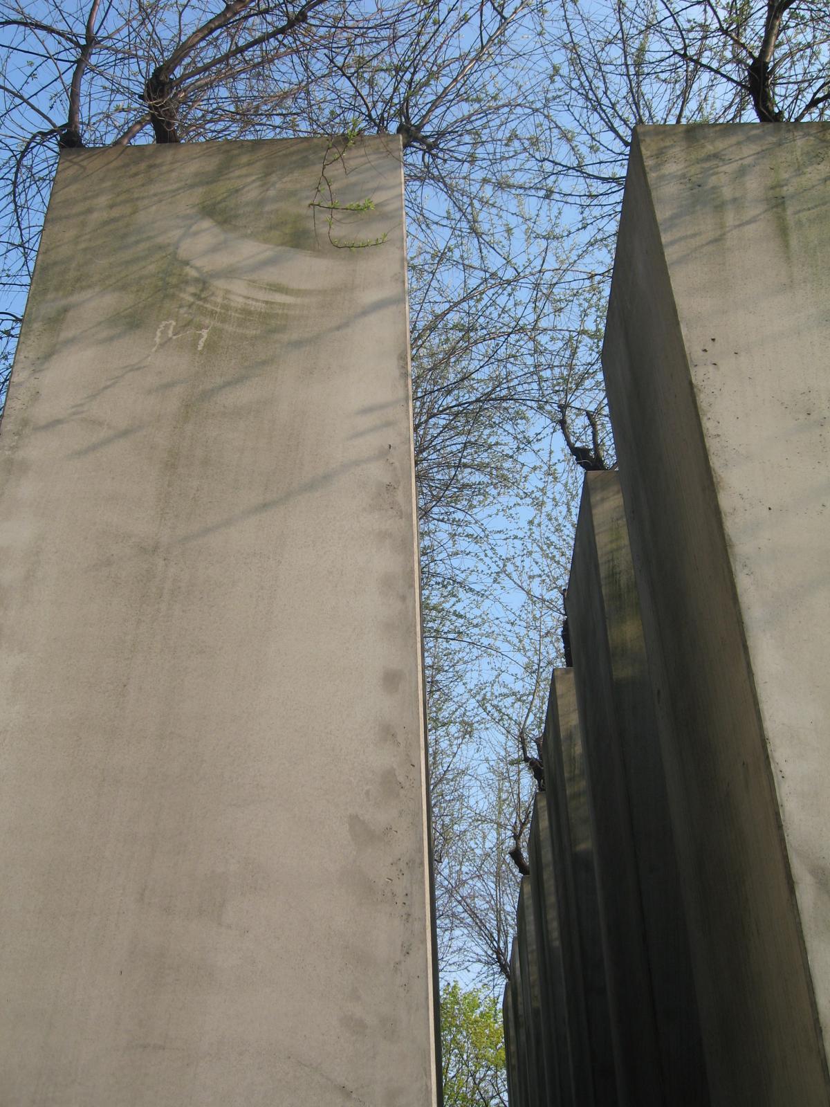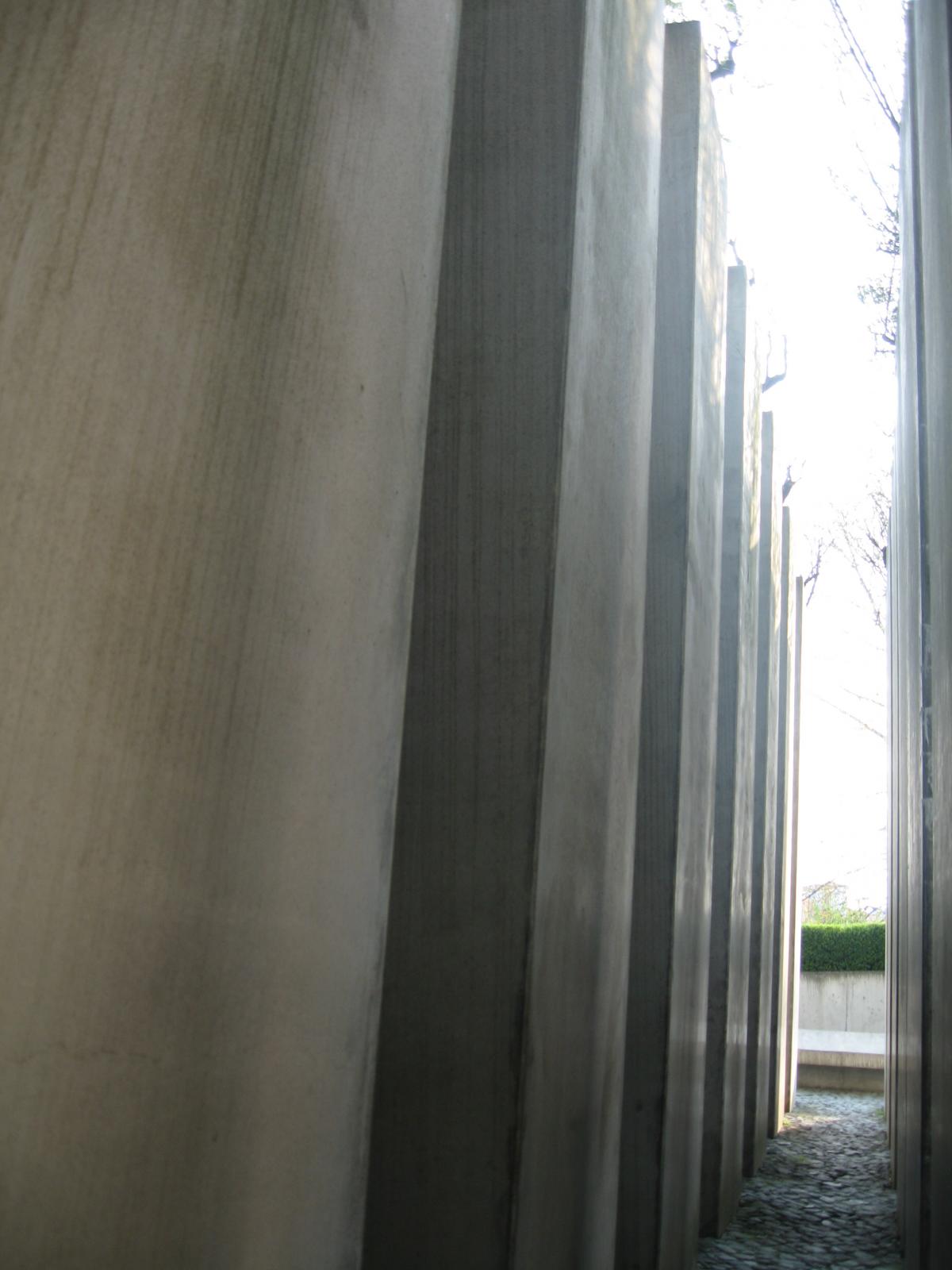 "Сад изгнания" (Исхода). Расположен во внутреннем дворике музея. На входе в него предупреждение, что людям со слабым вестибулярным аппаратом посещение не рекомендовано (примерно так с английского). Слегка наклоненные стелы, слегка косой пол, видимо, заставляющие организм принимать положение, параллельное этим столбам, создают эффект, когда неведомая сила начинает бросать тело от одной стены к другой. Ощущение, что вполне себе ровный пол уходит из-под ног. Смысл происходящего - вызвать чувство потерянности, безысходности.