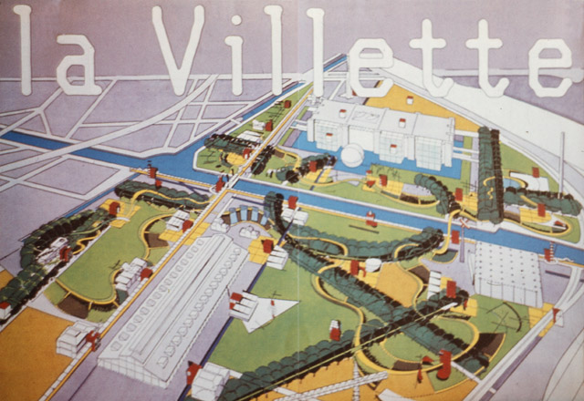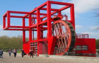 По всей территории ритмично расставлены разнообразной конструкции красные павильоны "фоли".