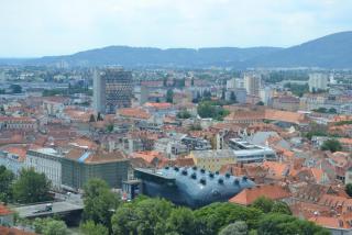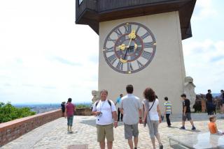 Наш экскурсовод пока не свободна, занята на другой экскурсии. Ирина предлагает воспользоваться свободным временем в течение примерно 1 часа до встречи с экскурсоводом сориентировав нас на местности. Пока группа отправилась в подземный переход на санитарные нужды, мы решили не терять время, т.к. его катастрофически мало. Сразу отправились к горе Шлоссберг, чтобы совершить подъем. DSC_0532.JPGDSC_0533.JPGDSC_0535.JPGКупили билет (стоимость 1 евро) на лифт только наверх, решив обратно спуститься по лестнице. Но в таких жёстких временных условиях понимаем, что это опрометчиво. Мой совет, покупать билетики сразу вверх и вниз, потому что наверху билет надо покупать в автомате. Пока найдешь с ним общий язык, уходит драгоценное время.
