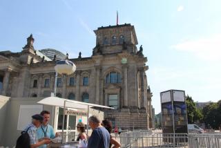 Опубликовано 28 августа, 201312 г. Автор comment_358829 День 3. 6 августа (вторник) Утро встретило нас солнышком и ясным небом. К завтраку мы вышли сразу с чемоданами, и оставив их на рецепшене отправились кушать. Сосисок хватило всем, да и вообще в этот раз в Барановском я был сыт после завтрака. В назначенное время все были в автобусе, и мы отправились в Берлин. Около 09.00 въехали в пригороды Берлина. Чем ближе к центру, тем интенсивнее становилось движение автотранспорта. В 09.30 мы подъехали к Трептов парку. Артем указал направления движения и оговорил время на посещение - 20 минут. Мемориал меня конечно впечатлил. Все продумано, красиво выполнено, и очень чисто и ухожено. Даже березки здесь посажены с ветвями, как у плакучей ивы. Мне показались они здесь очень кстати. Вернувшись на автостоянку, мы обнаружили еще один автобус ТТВ. Потом, его же, мы встретили у Рейхстага. И вообще в туре частенько видели автобусы ТТВ в разных странах - что сказать, «высокий» сезон! :i-m_so_h: После Трептов парка мы отправились в центр. По пути увидели вот такой цветочный дом. Потом проехали мост через Шпрее, рядом с которым установлен Молекулярный человек. После моста на нашем пути появилась Берлинская стена, вернее ее остатки. Судя по надписям на рисунках, нашлось много желающих оставить здесь память о себе. Вскоре показались телебашня и воздушный шар на городом. В отличие от Варшавы, у нас был свой план на время в Берлине. Мы планировали оторваться от группы в районе Александерплатц, но первая остановка была назначена на Музейный остров. Я даже не знаю, ходила ли группа к фонтану Нептуна, но может про это Аня напишет. Прибыли мы туда в 10.20. Первым пунктом нашей программы был Рейхстаг. Приглашение, распечатанное еще дома, лежало в сумке, и мы пошли на остановку сотого автобуса. Подошли, посмотрели расписание – до автобуса было три минуты. Читал на форуме, что автобусы в Берлине ходят строго по расписанию. Мы были свидетелями обратного. Видно разгар туристического сезона, пробки и т.д. Но через пару минут на табло вместо минут появилась надпись, типа – автобус опаздывает. Подъехал он минут через 7-8. И еще меня поразил уличный свет, горящий средь бела дня, и связка ботинок, висящая на проводах. Что-то в «орднунге» сломалось, однако. :biggrin: Как подошел автобус, мы вошли, купили у водителя групповой билет (у нас в планах было еще поездка на С-банн до Зоо). Я думал, что они заранее распечатанные на картоне лежат у водителя, а оказывается рядом с ним установлен такой аппарат, который эти билеты и печатает. В общем купили билет, забрались на второй этаж и поехали по Унтер ден Линден к Рейхстагу. Стекла в автобусе были грязные, поэтому за качество фото извините. После университета имени Гумбольта попали в небольшую пробку минут на 12. В 10.45 мы зашли в пропускной пункт Рейхстага. Подали мужчине за столом паспорта и приглашение, он нашел наши фамилии в списках, сверил с паспортами и пригласил пройти на проверку. Мы прошли через рамку, сумки проехали через просветку. Затем мы встали у дверей ждать, пока наберется группа. Как накопилось человек 15-20 мы пошли к зданию Рейхстага. Такое количество людей, как я думаю, вмещается в лифт, поэтому и группа такая собирается. В холле висит триколор цветов флага Германии. Вскоре спустился лифт с группой на выход, и мы прошли в него и поднялись на верх. Прямо у лифта сто
