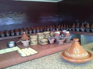 На первое должен был быть марокканский салат, затем на выбор тажин из курицы или кюфта из мяса говядины, десерт и мятный чай. Обед начался с покупки за отдельную плату знаменитого серого марокканского вина по 140 Дирхам за бутылку(12 евро). А вот потом нас ждал полнейший облом. За столы нас посадили по 8 человек, разделов таким образом, чтобы кто заказал курицу сидели отдельно от тех кто заказал кюфту. Потом принесли 5 тарелочек с разными солено- маринованными овощами в таком количестве, что на всех восемь человек не хватило даже по пол-ложки, чтобы только попробовать, а не то чтобы поесть. Затем принесли один тажин в котором оказалось была еда на всех 8 человек - это одно яйцо и по 4 маленьких фрикадельки- поместилось все это в две столовых ложки. Чтобы хоть немного насытиться мы жевали очень вкусный хлеб.