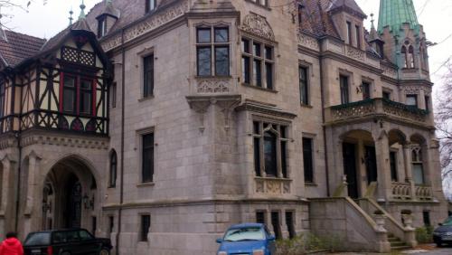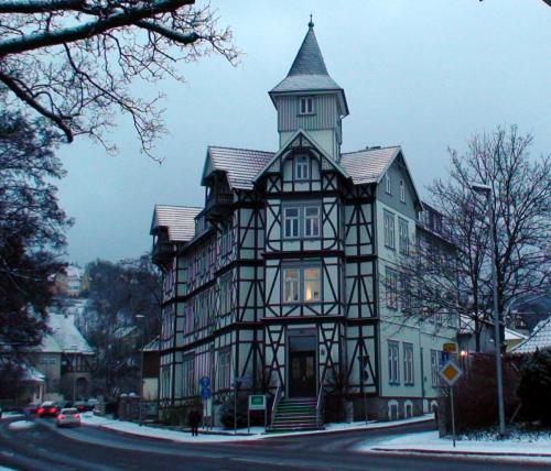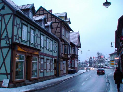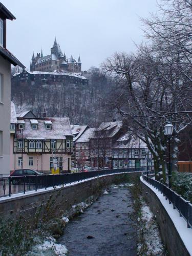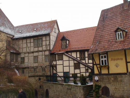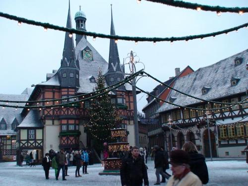 Короткий переезд и перед нами яркий, очень живой, ярко раскрашенный Вернигероде. К сожалению, по соображению безопасности после прошедшего снегопада, паровозик не ездил на гору к замку, так что осмотр одной из самых популярных достопримечательностей в Вернигероде - прекрасный замок, построенный в начале XII столетия графом Адальбертом. И конечно для нашего туриста, одной из особенностей этого замка было то, что здесь снимался фильм про барона Мюнхгаузена, и надо же такому совпадению, сейчас когда пишу эти строки, фильм как раз идет по одному из теле каналов. Много читала про замок и конечно хотела все удитесь… Но ни что не меняет нашего сказочного настроения - будем осматривать в следующий раз. (Хотя надо честно признать несколько человек стойко полезли в гору и им удалось и осмотреть замок и сделать прекрасные фото.)  Нам же пришлось довольствоваться взглядом на замок снизу, с улиц города (уже дома, просматривая фото радуюсь их сказочности: и первые при дневном свете и особенно завораживающие в вечерних сумерках, когда в замке зажглись огни).