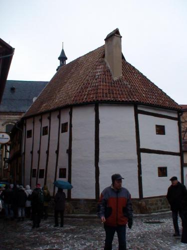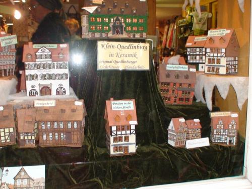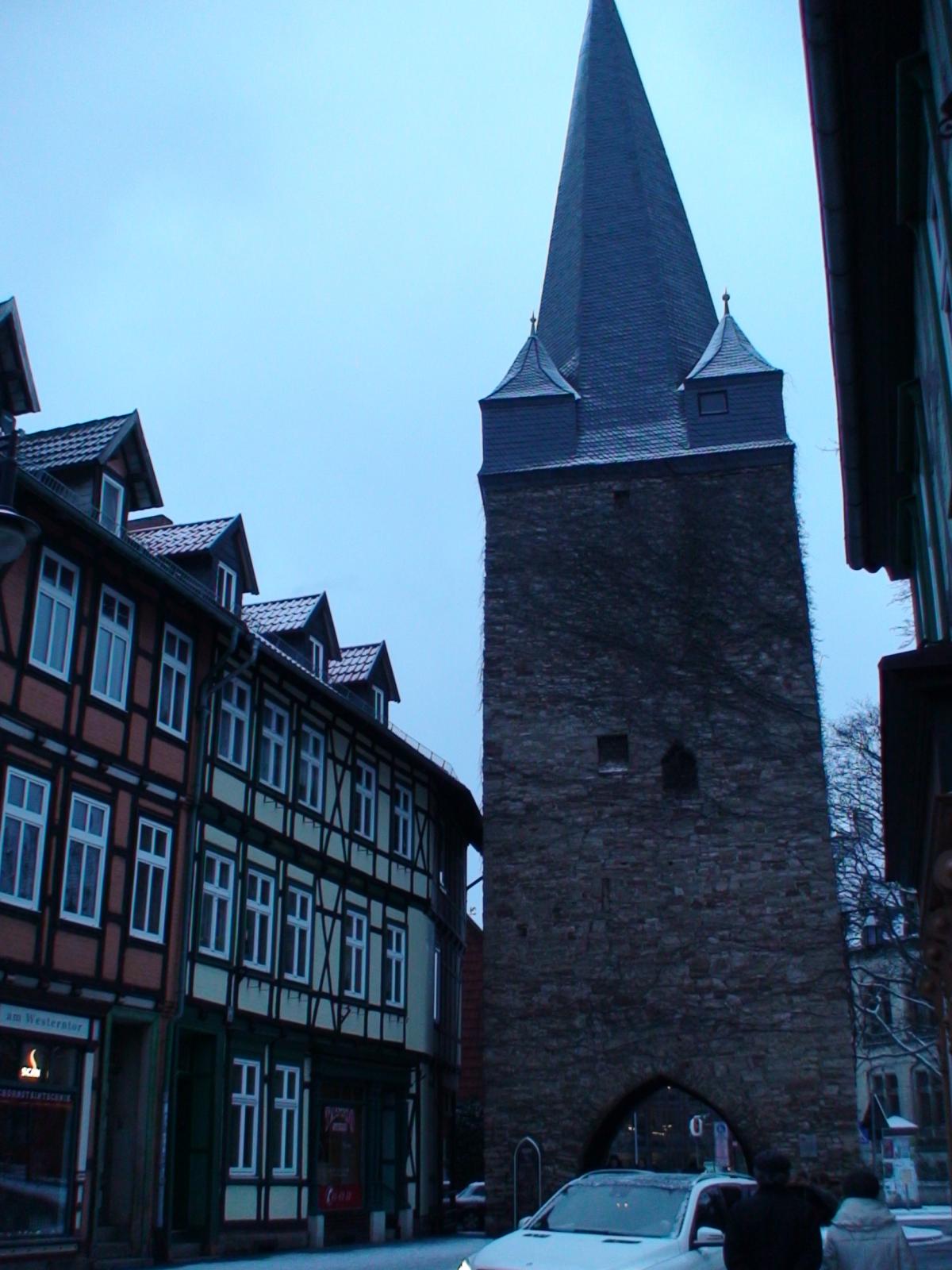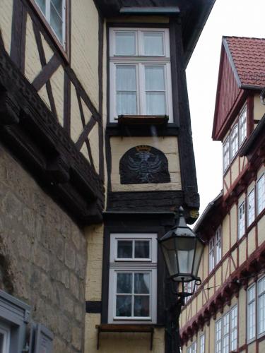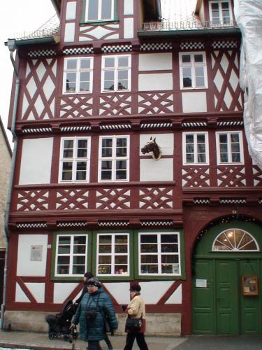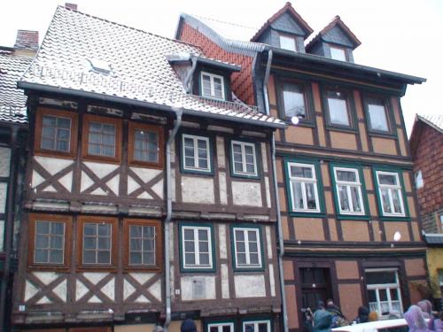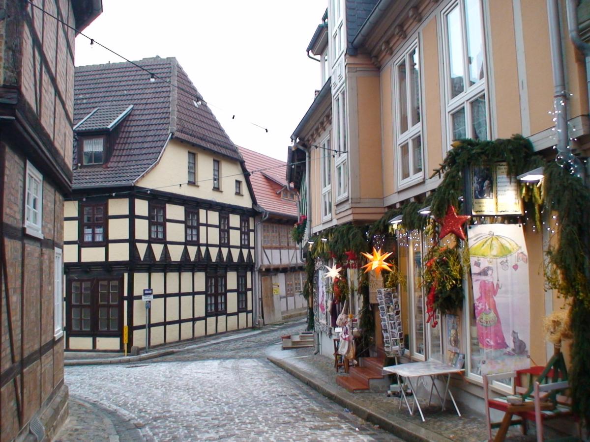 Проходим по центральной торговой улице городка, любуясь старинными постройками и ярко украшенными витринами, доходим до ратушной площади. Этот город очень сильно отлИсторическая ратуша – один из символов города. Прежде здесь был игорный дом. Сцена находилась на втором этаже, бродячие артисты увеселяли графов фон Вернигероде.  Приблизительно между 1427 и 1450 игорный дом был снесен и на его месте построили каменное здание.  Дальше поднимаемся в строну замка до самого маленького дома, внимательно слушаю комментарии гида по дороге. Все-таки, какое это подспорье: все рассмотреть, найти точку для съемки, можно внимательно слушать, и не отстать от группы. Самый маленький дом (Kochstrasse 43) в Вернигероде построен в 1800 году. Ширина домика не больше двух узких окошек. Дом состоит из коридора, кладовки и крохотной спальни под крышей. До 1976 года в нем жила одна женщина. С 1992 года дом открыт для туристов. Кривой дом (Klintgasse 5) находится вблизи от Ратуши. Это бывшая водяная мельница, которая была перестроена в дом,  течение мельничного канала подтачивало его. В результате дом опустился на скалу. Следов от канала не осталось, а дом так и остался кривым.