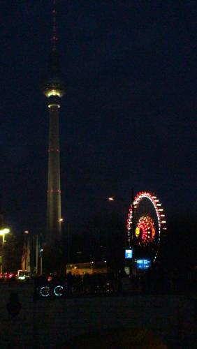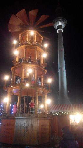 Выходим из автобуса, настроение – блеск, душа выпрыгивает и рвется наружу, впереди 3 часа свободного полета по, так близкому моему сердцу, Берлину. Центральный кафедральный собор, празднично украшенная торговая улица, которая помнится, долгими (и удачными) поисками туалета в наше первое посещение города. Идем в направлении ярмарки, которую видно издалека, по ярко украшенному чертову колесу. Сразу покупаем глинтвейн и соответственно первую кружку в коллекцию, народу очень много, разноязычная речь, и что бывает редко почти не слышно русской. Много детей, их катают на пони, на каруселях, на колесе обозрения, кругом активно пьют глинтвейн, который здесь называют глювайн, едят различные колбаски и что-то походе на наш хворост. Сама ярмарка организована на площади вокруг фонтана Нептуна, (так что Адмирал не смог, по своей привычке поцеловать ручку, одной из его дочерей) фонтан, конечно, не  работает, за то вокруг него залит искусственный каток, на котором в основном катаются дети. Пытаюсь сфотографировать изумительную резную игрушечную мельницу на фоне телебашни и городской ратуши (не судите строго).