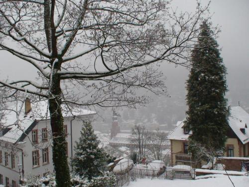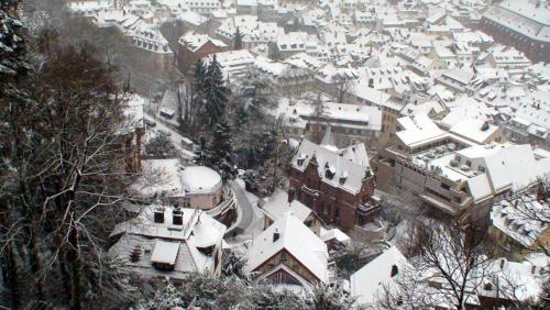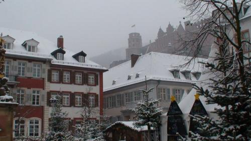 Как всегда ранний завтрак и снова в путь. Ехать не далеко. Температура за окном плюсовая, снег еще лежит, но уже очень слякотно. Выходим из автобуса, встречаем гида, которая радостно рассказывает нам, что снега в городе не было несколько лет и что все ему очень рады,  проходим по еще спящим улочкам мимо заснеженного, и как будто не живого рынка, около здания ратуши, направляемся к главному храму города. Не спеша, под рассказ гида обходим цент города. Узнаем, что название города Гейдельберг  в переводе означает «гора с черникой» (и так сразу захотелось черники спелой, сладкой, душистой, и чтобы целую горсть сразу, даже летом запахло). Проходя по его старым улицам, слушаем рассказ о бурной истории этого немецкого города, несколько раз подвергшегося осадам, полностью уничтоженного в 1693 г. войсками французского короля Людовика XIV. Большая часть города связана с университетом. Гейдельбергский университет – самый старинный в Германии, основан в 1386 г. Осматриваем университетскую часть городка, где конечно здание библиотеке выделяется из общего фона и цветом и фактурой, и снова возвращаемся к фуникулеру.