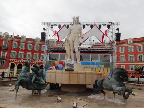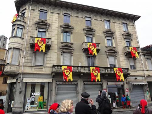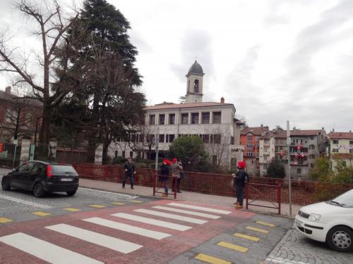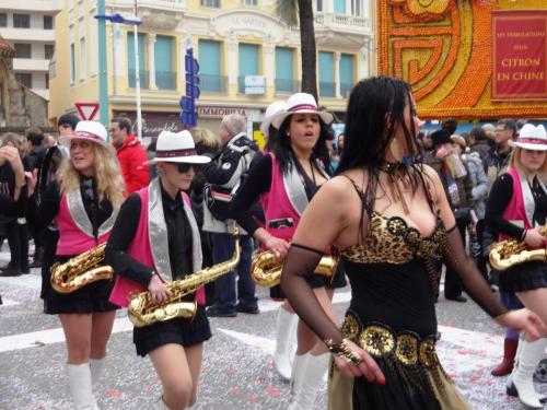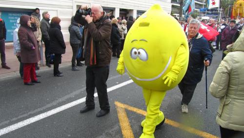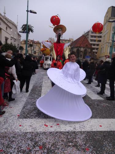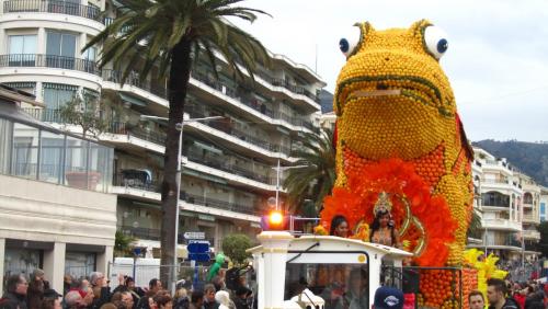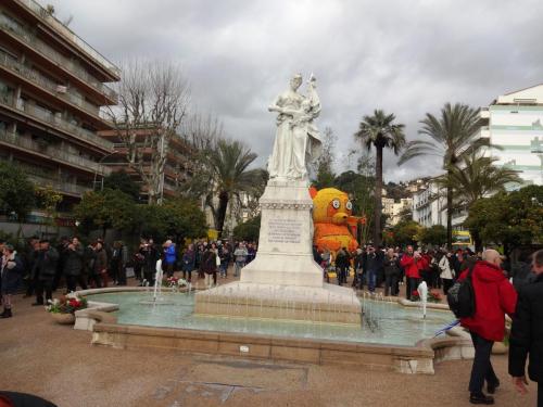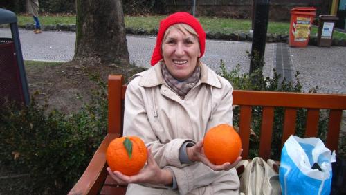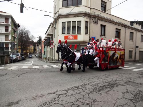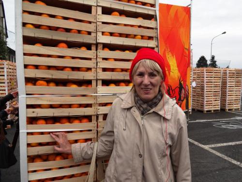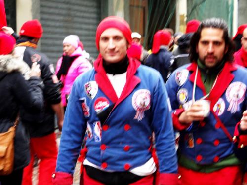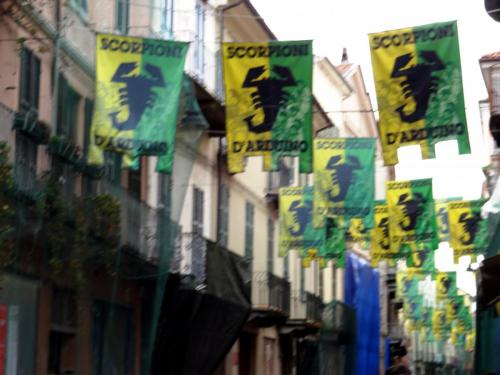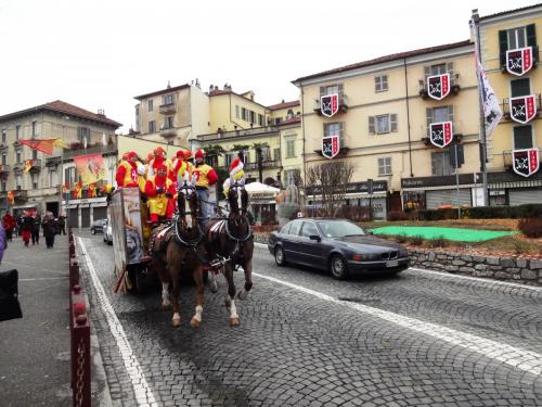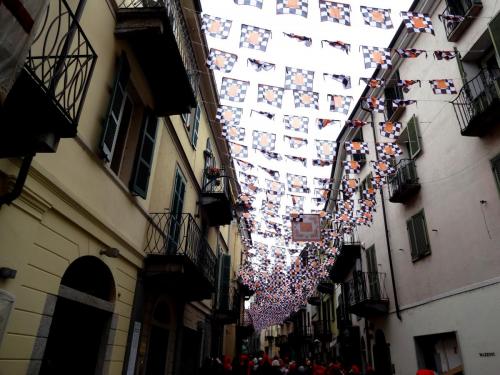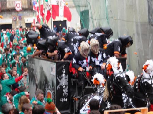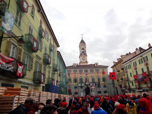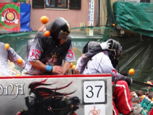 День для нас начался рано, в 7.45 позавтракав, мы выехали из Ментоны. Впервые ТТВ организовал поездку  на этот карнавал и мы были в числе первооткрывателей этого города и посещения карнавала. Нам предстояло проехать из Франции в Италию 330 км в старинный город Иврея, где проходит знаменитый "Апельсиновый карнавал", символизирующий приход весны: команды местных жителей в карнавальных костюмах кидаются апельсинами. Метание апельсинов - это древняя традиция со времен средневековья. Ежегодно используется 360 тонн апельсинов, которые привозят из Сицилии. Деньги на покупку апельсинов на карнавал в качестве налога берут с местных жителей. Одним из атрибутов карнавала является фригийский колпак (шапка, шарф) красного цвета, его одевают, чтобы апельсины в человека не бросали. Поэтому как только мы приехали в Ивреа, то большинство группы на остановке автобуса купили эти атрибуты (стоимость 5Е) и ходили в них все время пребывания в Ивреа. Начало апельсиновой битвы в 14.30, поэтому мы сначала осмотрели этот старинный город и увидели приготовление команд к битве. В битве принимало участие 9 команд метателей (пики, смерть, шахматы, вороны, скорпионы, черная пантера, дъяволы, наемники, верующие). По окончании битвы специальной комиссией оценивающей ход битвы, выдавалась премия тем, кто с большим рвением метал сладкие снаряды. Весь город был украшен флагами команд-участников.
