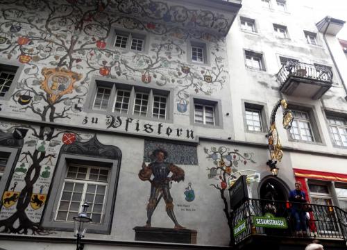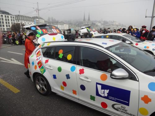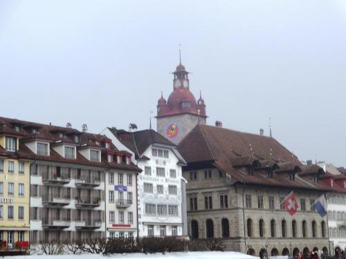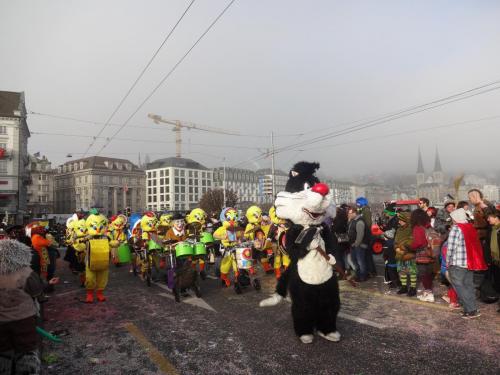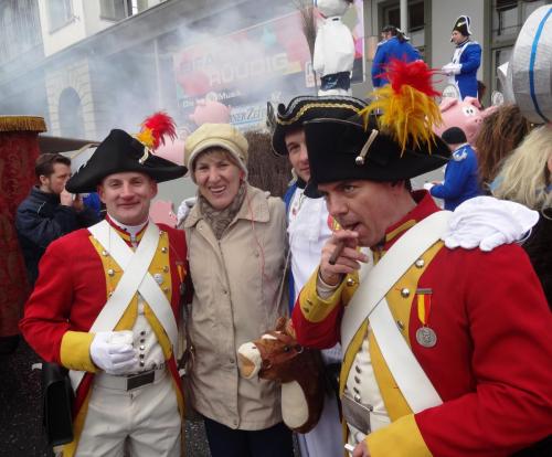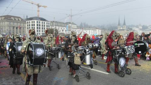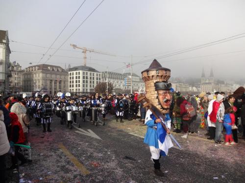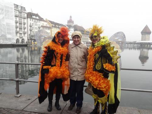 Находясь еще под впечатлением первого дня, после завтрака мы в 9.30 выехали из Цюриха в Люцерн (60 км). В Люцерне был туман и мы надеялись, что во время карнавала в 14.00 его уже не будет. Когда мы въехали в город, то на всех улицах видели участников карнавала в масках монстров, множество оркестров. Оля в автобусе рассказала нам про программу пребывания в Люцерне, кроме того была предложена экскурсия на кораблике по Фирвальдштатскому озеру, окруженному горами. Но во время тумана желающие увидеть Пилатус не смогли его увидеть. Для меня Люцерн был новым городом Швейцарии, поэтому мне захотелось узнать его побольше. Во время обзорной экскурсии мы прошлись по самому старому мосту Европы (1333 г.) Капельбрюкке, увидели достопримечательности старого города и побывали на мемориале "Умирающий лев". Я в турах по Европе много видела памятников льву, но этот памятник меня поразил тем, что высечен прямо в скале. После обзорной экскурсии в свободное время мы побывали с Ольгой в магазине часов, перекусили в кафе и к 14.00 заняли места на мосту Зеебрюке, по которому будут проходить участники карнавала (40 официальных и неофициальные участники). Я от карнавала была в восторге, ведь это был первый для меня европейский карнавал. После карнавала я с подругами побывала на концертах духовых оркестров в здании жд вокзала и недалеко от ратуши. Весельем были заряжены не только жители Люцерна, но и гости города.