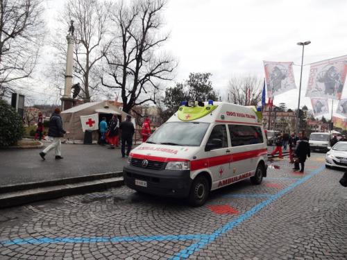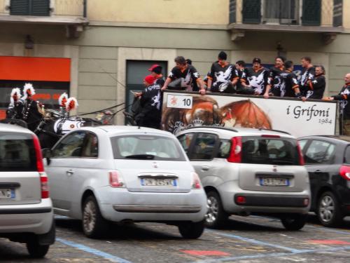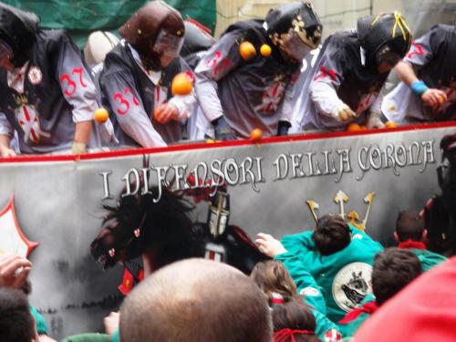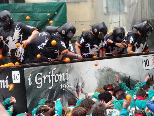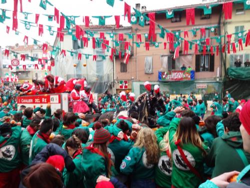 Праздничная Ивреа еще до апельсиновой битвы очень понравилась и наверно большинство туристов  были рады, что побывали здесь. В 14.30 началась битва и это надо было видеть!!! С каким азартом участники бросали друг в друга апельсины! Правда участники на повозках были в лучшем положении, они были в касках. Но доставалось не только участникам битвы. но и азартным туристам, которые все это действо хотели запечатлеть. Я стояла недалеко от ящиков с апельсинами рядом с немецкими туристами и увидев, как апельсины летят в туристов, заняла более укромное место, чтоб до меня не долетели апельсины (спряталась за туристом). Не зря недалеко были машины скорой помощи и врачи. Думаю посмотрев на полученные синяки многие еще долго будут вспоминать этот карнавал. Но в восторге были все!!!