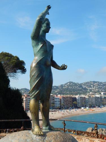 Тосса де Мар - это сказка!!! Мы с Машей приехали тоже довольно рано в 8:55, выезд был в 8:30. Дорога с серпантином, но вполне переносимым, периодически открываются красивые виды на море. Город ещё не проснулся, прохожих мало, большинство магазинчиков закрыто.  Под рассказ Марии прошлись по улочкам города. Вначале я внимательно слушала (про плитку запомнилось:), но потом от нахлынувшего восторга и эмоций стала периодически переключаться на созерцание красивейших видов, на море, зелень, цветы. Какое спокойствие и умиротворение здесь царило!!! Разумеется, когда нам дали свободное время, мы вдоволь нафотографировались, потом спустились к морю, которое показалось всё-таки более теплым и спокойным, чем в Ллорете. Кто-то отправился на пляж, мы же в оставшееся время прошлись по набережной и магазинчикам, которых очень-очень много. Встреча была назначена на 12:15 у подножия крепости Вила-Велья у памятника, точный смысл которого сами не угадали, хотя предлагались разные версии, подсказала Маша:), здесь же поблизости бесплатный WC. Уезжать из Тоссы совершенно не хотелось!!! Для меня поездка в этот милый уютный городок со средневековой крепостью на холме, пожалуй, самое яркое впечатление об Испании! Вернулись в отель в 12:55.