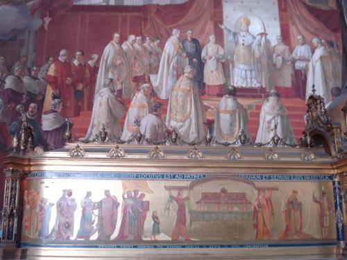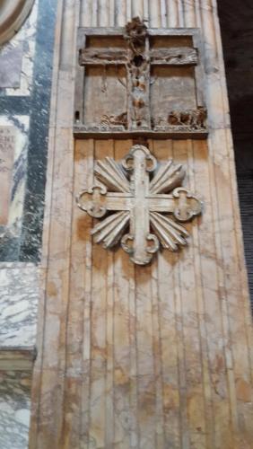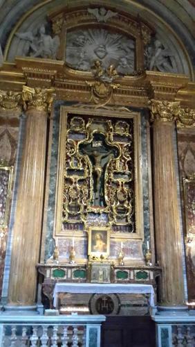 А вот Главный алтарь, который в XIX веке был реконструирован скульптором Антонио Сарти. Он выполнен в виде триумфальной арки из четырёх мраморных колонн, установленных под треугольным фронтоном с монограммой Христа.