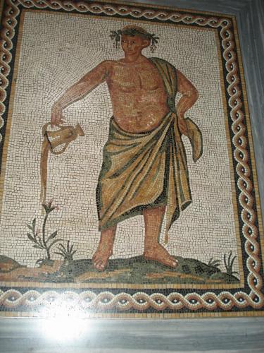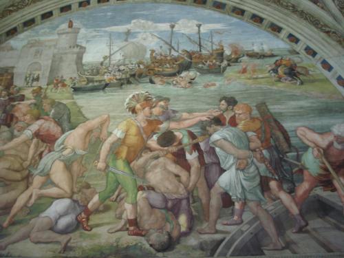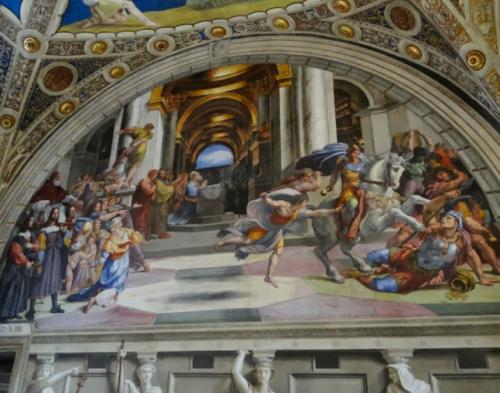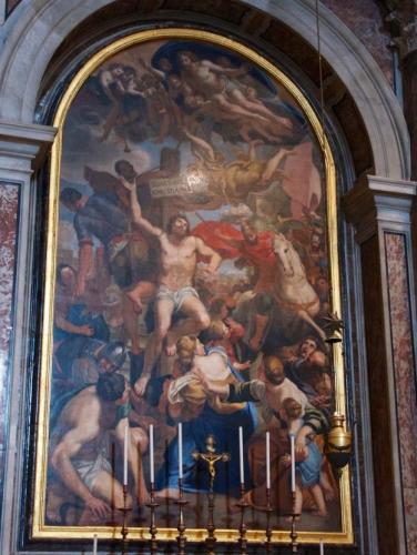 На Мозаике  изображена мученическая кончина Севастьяна, которого привязывают к дереву в роще Адониса на холме Палатин. Солдаты готовят стрелы к стрельбе. Но!!! Севастиан не был убит стрелами. Жена сановника Кастула, Ирина пришла ночью, чтобы похоронить его, но обнаружила, что он жив, и выходила святого. Многие христиане уговаривали Севастиана бежать из Рима, но он отказался и предстал перед императором с новым доказательством своей веры. На сей раз по приказу Диоклетиана он был забит камнями до смерти, а тело его было сброшено в Большую Клоаку. Святой явился во сне христианке Лукине и велел ей забрать его тело и похоронить в катакомбах, и женщина выполнила это повеление. Фреску заказал Доменикино папа Урбан VIII. Урбан из семьи Барберини особо почитал святого Севастиана, так как семейная капелла Барберини в церкви S. Andrea della Valle была построена как раз над местом, где нашли тело святого в канализационном канале.