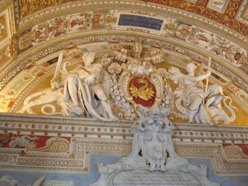 Слева - аллегория Религии, держит скрижали с законом Божиим. Справа - Знание. Барельеф напоминает об осуществленной папой реформе — введении нового календаря (григорианского). Дракон внизу - гербовое животное рода Boncompagni.