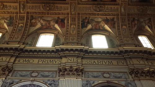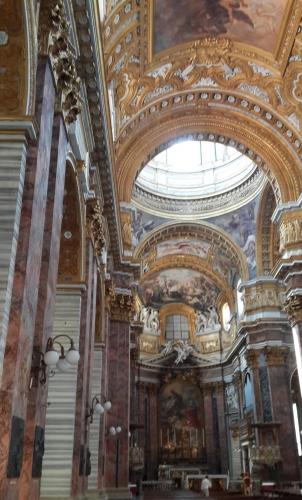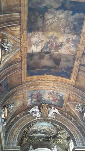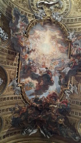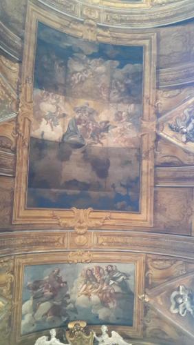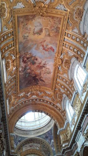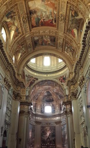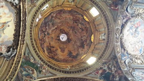 На купольном плафоне -  фреска «Триумф Иисуса» работы Джованни Баттиста Гаулли. Это уникальная многоцветная роспись, выполненная с эффектом объёмного изображения. Фигуры святых, пророков и Отцов церкви кажутся на ней рельефными, отражающими свет и отбрасывающими тень. В действительности изображение плоское, и это только художественный приём.
