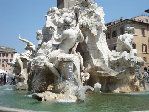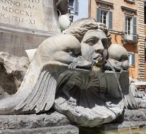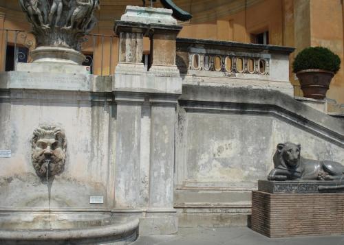 А мы спускаемся по центральной лестнице, которая создана по проекту самого Микеланджело. Эту лестницу называют Кордонатой (Cordonata). Вверху лестницу укрошают статуи близнецов Диоскуров в окружении лошадей. Изначально эти статуи были установлены в театре Помпея, на холм статуи перенесли во второй половине шестнадцатого столетия. Ее подножие украшают два фонтана в виде львов, созданных из черного гранита.
