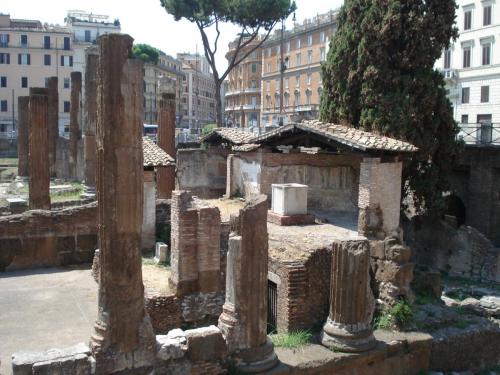 и идем дальше к Площади Торре-Арджентина – это знаменитая римская площадь, где можно полюбоваться древними развалинами археологической зоны, известной под названием «Святая площадь». В 1926 г.В центре площади начались раскопки четырех храмов, самых значимых священных построек времен Римской республики. Один из храмов — круглый — однозначно опознан как «храм удачного дня» или, если можно так выразиться, «храм ежедневного везения» (Aedes Fortunae Huiusce Diei). Относительно трех других ученые не пришли к общему мнению. Все четыре храма входили в комплекс гигантского театра Помпея (Teatro di Pompeo). Театр Помпея являлся первым римским амфитеатром и был построен в 55 году до н. э. Его арена вмещала, по разным данным, от 12 до 27 тысяч человек. Однако театр Помпея прославился не столько пышными зрелищными мероприятиями, сколько тем, что в портике перед входом на арену был убит группой бывших соратников Гай Юлий Цезарь.
