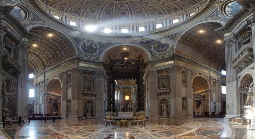 В подкупольном пространстве над главным алтарём (схема - 82-87) возвышается балдахин Святого Петра работы Лоренцо Бернини (1624-33). Главный (папский) алтарь собора - 30-метровый балдахин выполнен из бронзы. Вверху стоят статуи ангелов. Между этими ангелами одна пара ангелочков держит символы папы - ключи и тиару, другая пара ангелочков держит символы Св. Павла - книгу и меч. Главный алтарь называется папским, поскольку служить перед ним мессу может только папа римский. Алтарь освящен папой Климентом VIII 26 июня 1594 г. Алтарь изготовлен из большого куска мрамора, привезенного с форума императора Нервы.
