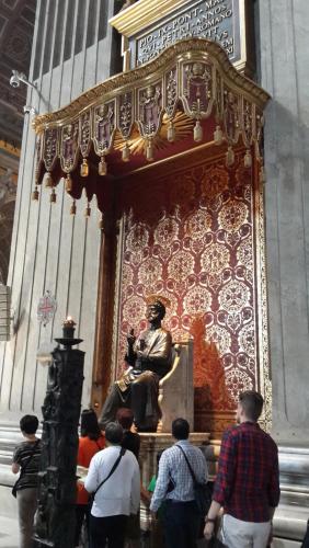 Он сидит на папском престоле, а в руках держит ключи от Царствия Небесного. Статуе приписываются чудодейственные свойства, и многочисленные паломники благоговейно прикладываются к бронзовой ноге. Есть примета, по которой, если загадать желание и прикоснуться при этом рукой к стопе Петра, искренне попросив об исполнении задуманного, все непременно сбудется. Мы тоже выстроились в очередь…