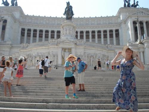 В древние времена именно на этом холме были расположены Храм Юноны Монеты, Храм Минервы и Храм Юпитера. В последующем на холме был построен христианский монастырь, уступивший в дальнейшем место церкви Санта-Мария-д-Арачелли. К сожалению церковь была закрыта, а так хотелось туда попасть. Огромная лестница, к ней ведут 124 мраморные ступени. Некоторые люди верят, что если взобраться по лестнице, стоя на коленях, молясь и думая о числах, то можно запросто выиграть в лотерею. На коленях мы конечно же не стали подниматься, а просто посидели на ступеньках…