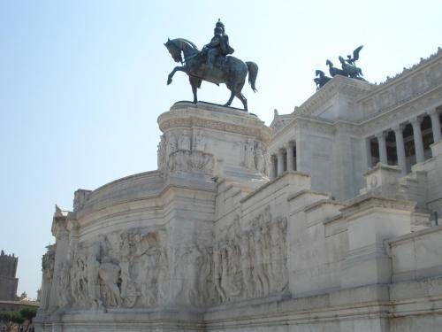 Разделенная на марши, лестница доходит до гигантской статуи Виктора-Эммануила II (1901г.). Над статуей воздвигнуты шестнадцать колонн завершающего портика, на которых установлены статуи, символизирующие области Италии. Гигантский монумент (135 метров в ширину, 130 метров в длину и 81 метр в высоту) украшают фризы, бронзовые рельефы, мозаики. По левую сторону от монумента находится Пантеон знамен Вооруженных сил, а по правую - вход в Центральный музей Рисорджименто.