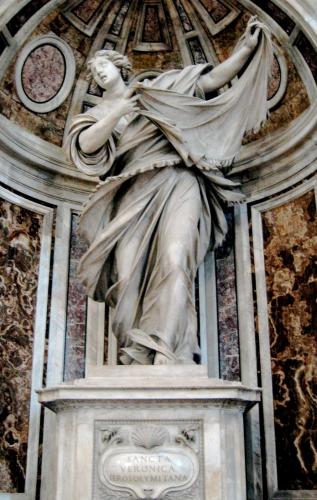 Статуя Святого Лонгина (схема - 88). Реликвия - копье Лонгина  В 1492 г. Баязид подарил папе фрагмент копья, которое, как считалось, принадлежал сотнику Лонгину . «Я победил мрамор и сделал его гибким как воск — говорил Бернини - и этим самым смог до известной степени объединить скульптуру с живописью» (1635 г.). Лонгин изображен в момент поклонения невидимому распятому Христу – распростертые руки, откинутая назад голова, клубящиеся складки плаща, стянутые сбоку в напряженный узел.