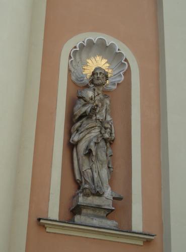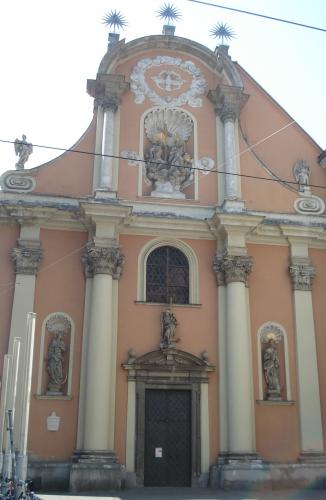 Фасад церкви - Над боковыми фронтонами – ниши со скульптурными изображениями святого Каэтана и святого Андрея Авеллино, на фронтоне   над центральным порталом – аллегорические скульптурные изображения Надежды и Бедности, а также герб ордена театинцев. В верхней части фасада доминирует роза, над которой помещен герб Медичи, поддерживаемый двумя мраморными амурами.