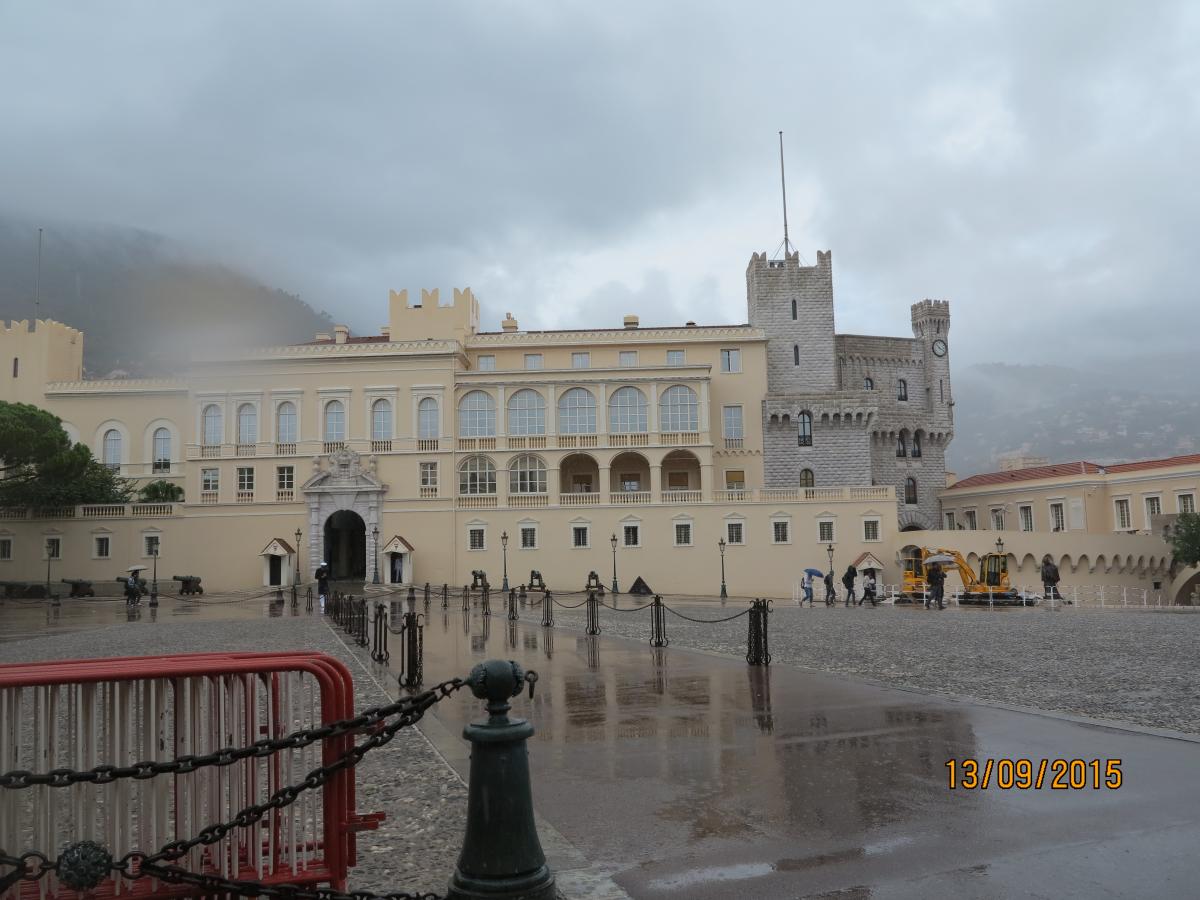Пока гуляли по парку дождь всё собирался с силами, стоило выйти к кафедральному собору, как он разошелся не на шутку. Оля спрятала нас под крышу собора, ведя при этом рассказ о династии Гримальди, о Монако- Вилль, о соборе. И в парк, и в собор мы ещё обязательно вернёмся, когда утихнет не на шутку разыгравшаяся стихия. Княжеский дворец разглядываем под дождем...